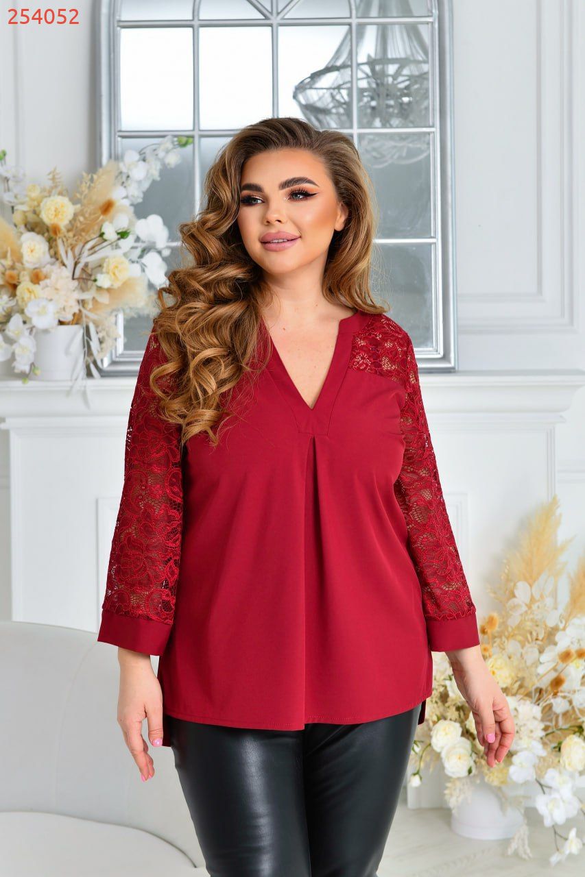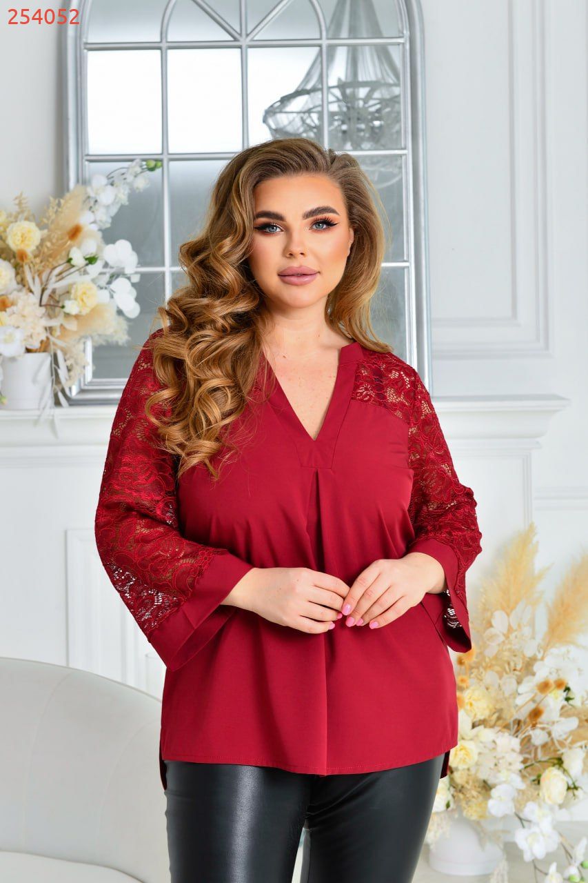 Виріз горловини V-подібний. Рукав трохи вкорочений, виконаний із високоякісного гіпюру, низ на манжеті. Низ блузи асиметричний, попереду трохи коротший. Застібок, кишень немає.