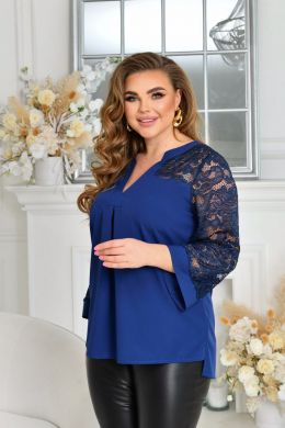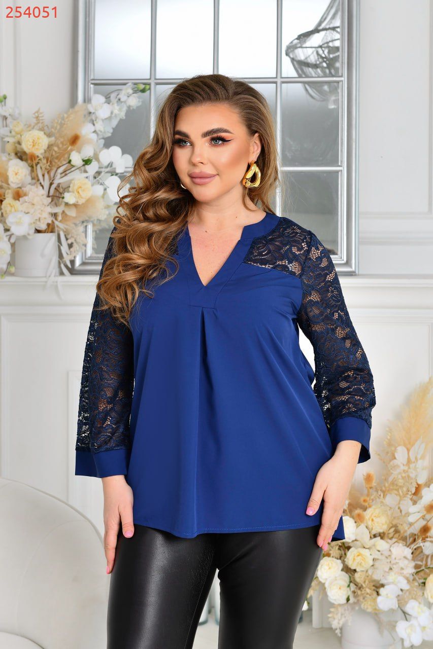 Виріз горловини V-подібний. Рукав трохи вкорочений, виконаний із високоякісного гіпюру, низ на манжеті. Низ блузи асиметричний, попереду трохи коротший. Застібок, кишень немає.