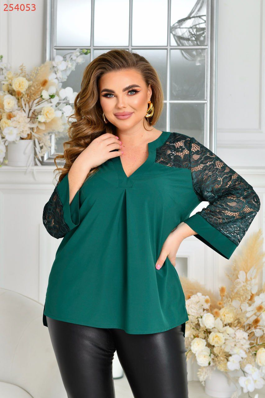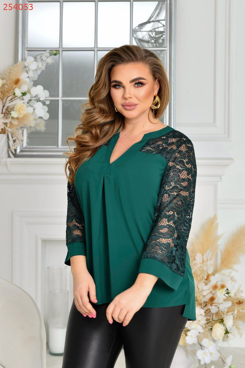 Виріз горловини V-подібний. Рукав трохи вкорочений, виконаний із високоякісного гіпюру, низ на манжеті. Низ блузи асиметричний, попереду трохи коротший. Застібок, кишень немає.