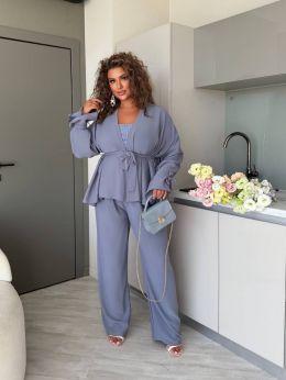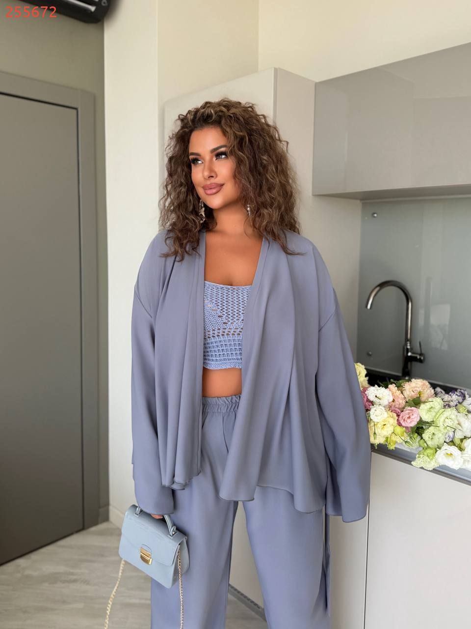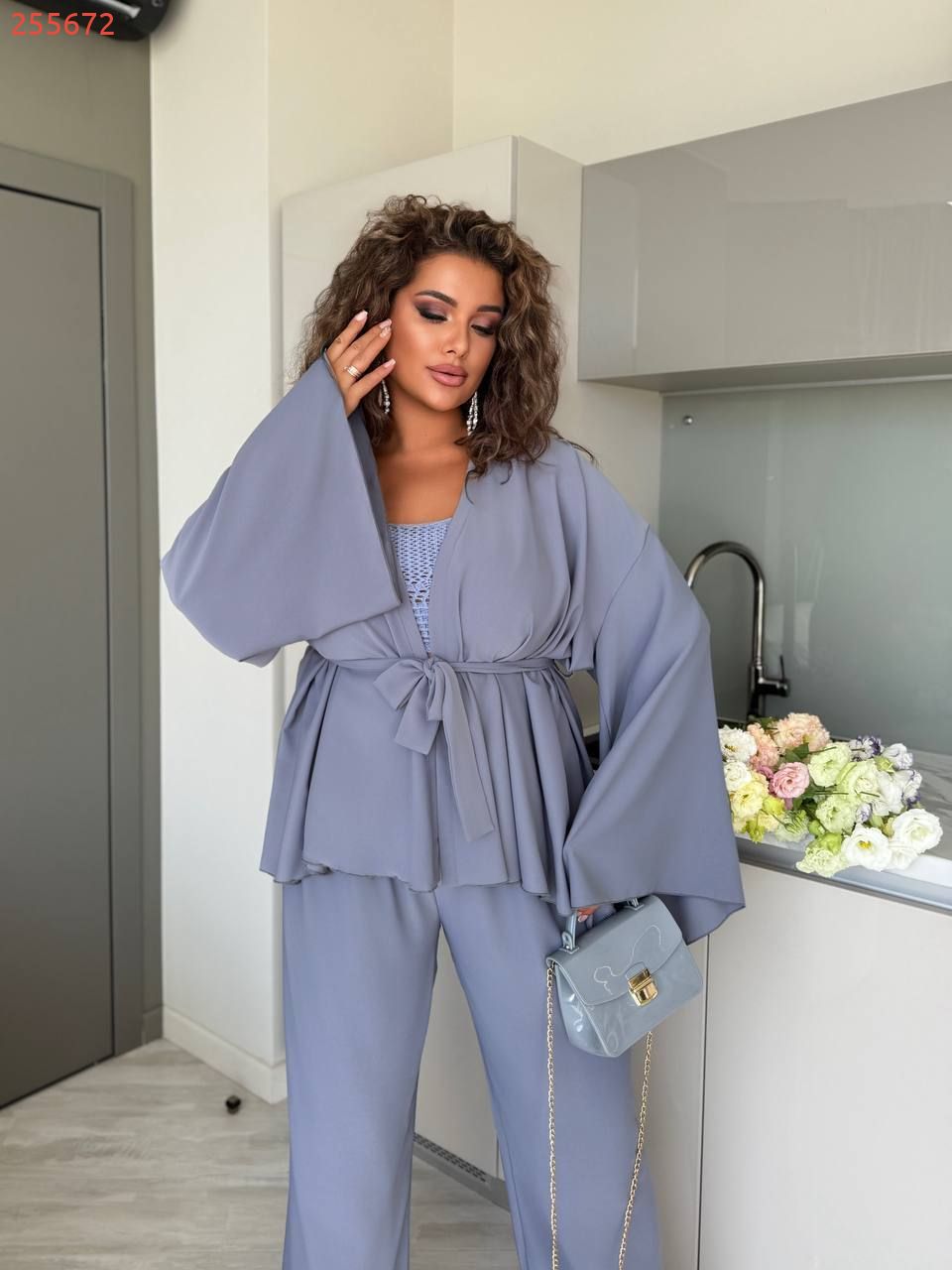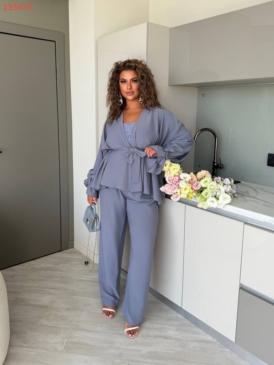 Довжина брюк 77/110. Пояс на гумці, висока посадка. Кардиган одягається на запах, підвʼязується поясом . Рукава внизу широкі, є знімни завʼязки, якими можна зробити іншу форму рукава завʼязав їх. Заміри по виробу: