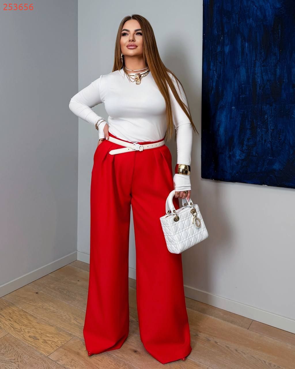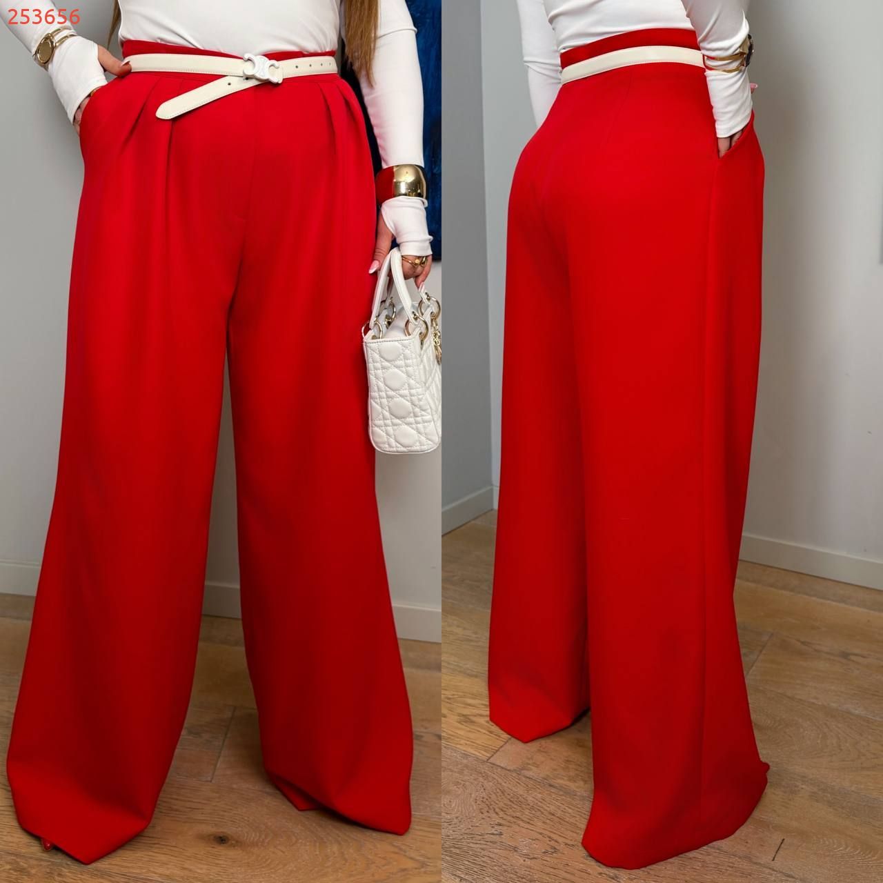Широкий крій візуально подовжує ноги, висока посадка підкреслює талію. Щільна костюмна тканина не мнеться, добре тримає форму. Фігура виглядає стрункішою.