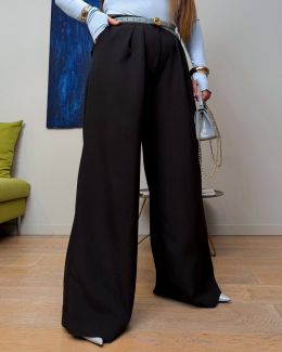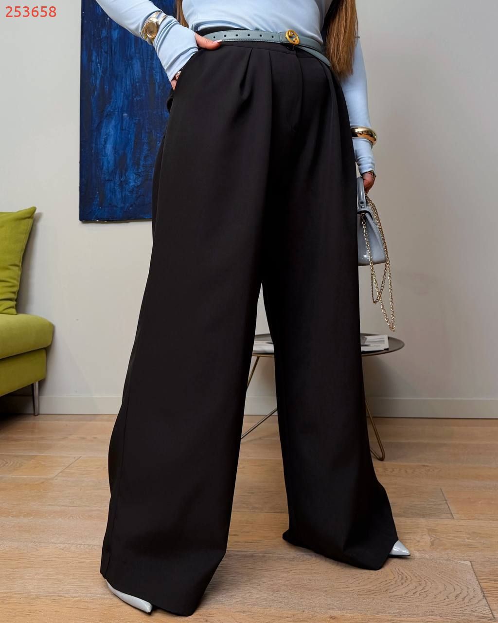 Широкий крій візуально подовжує ноги, висока посадка підкреслює талію. Щільна костюмна тканина не мнеться, добре тримає форму. Фігура виглядає стрункішою.