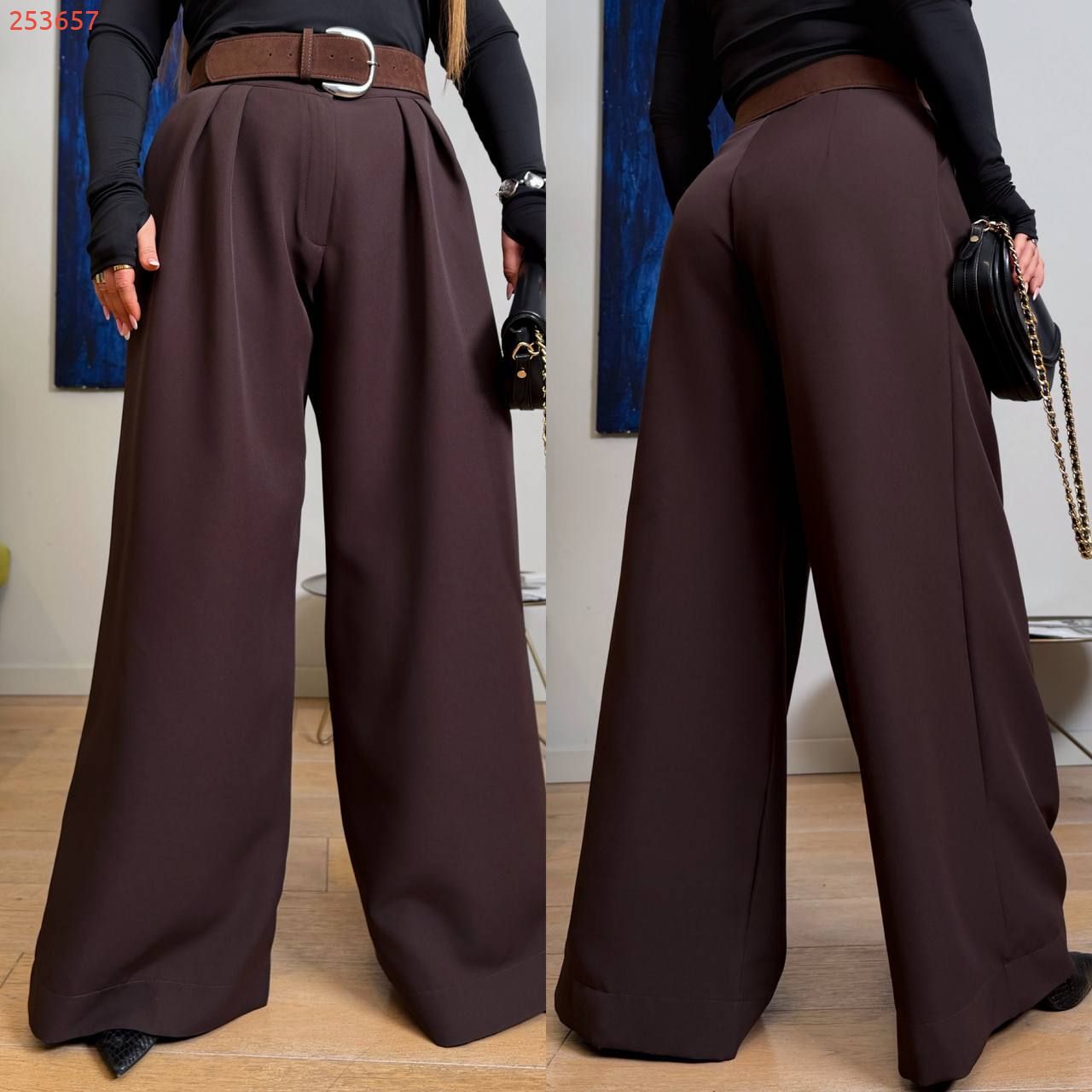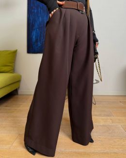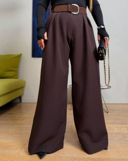 Широкий крій візуально подовжує ноги, висока посадка підкреслює талію. Щільна костюмна тканина не мнеться, добре тримає форму. Фігура виглядає стрункішою.