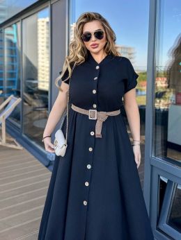 Сукня довга, виконана в стилі сорочки. Має короткі рукави з відворотами, круглий комір-стійку та застібку на гудзики по всій довжині. Талія підкреслена ременем. з металевою пряжкою. Вільний крій і легка тканина роблять сукню комфортною та універсальною для літнього гардеробу