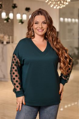 Ефектний джемпер вільного силуету. Джемпер виконаний у техніці "ручного в'язання" з ангори. V-подібний виріз виробу оброблений двосторонніми планками. Рукав у виробі спущений на манжеті по низу, виконаний з сітки з напиленням флока. Спинка у виробі без особливостей. Низ джемпера оброблений притачною планкою із основної тканини.