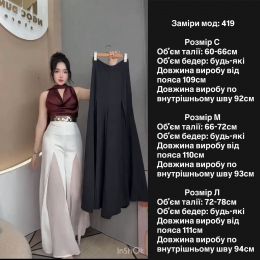 Елегантні та жіночні брюки, які ідеально підкреслюють фігуру та додають образу легкості. Завдяки вільному крою брюки виглядають стильно й витончено, підходять як для святкових подій, так і для стильних повсякденних образів.