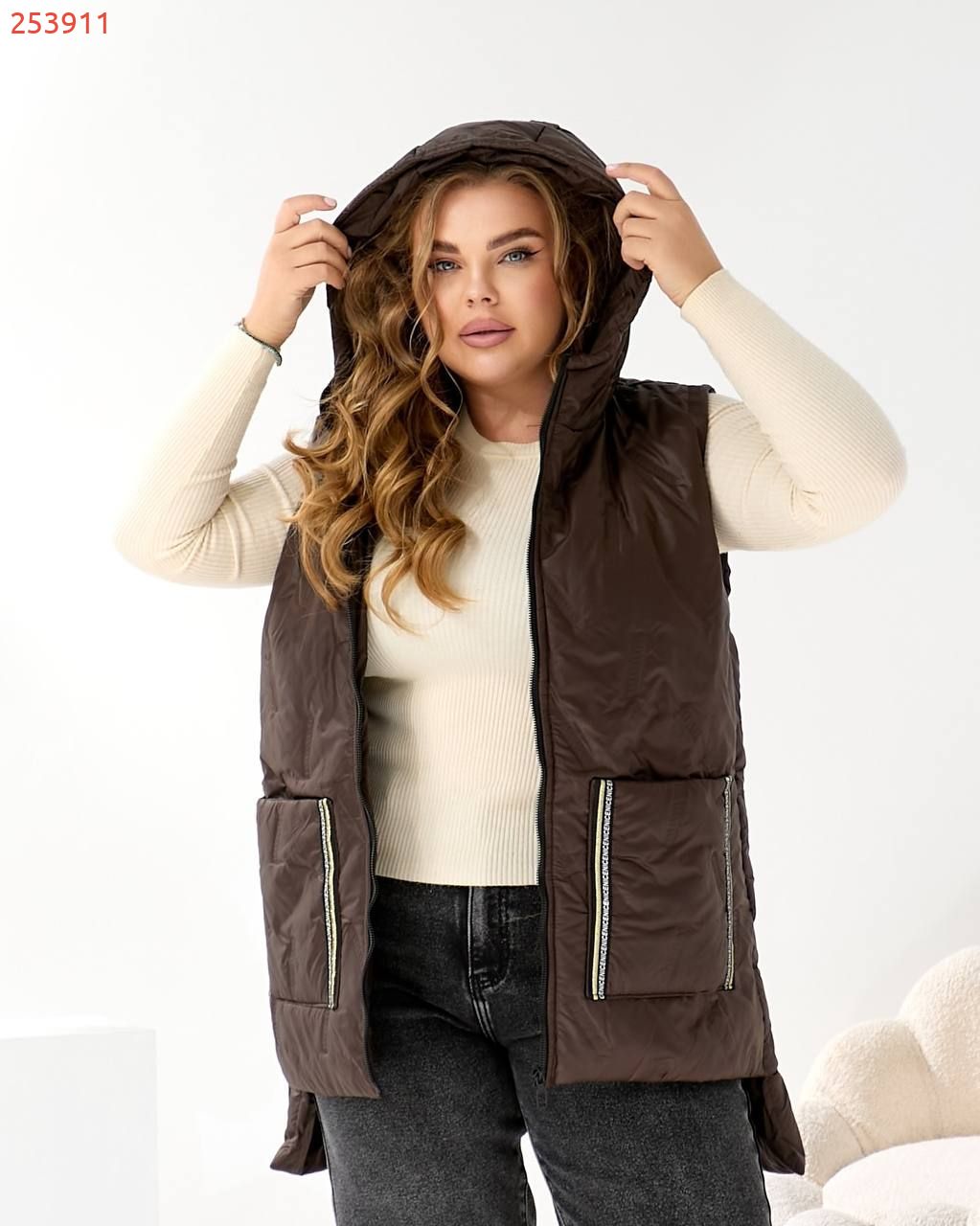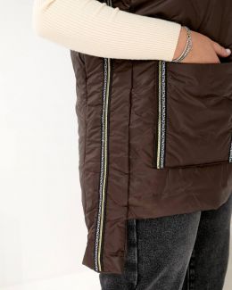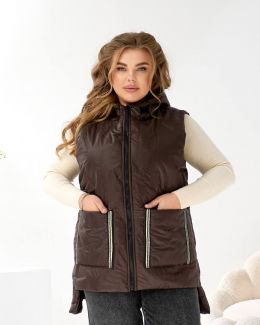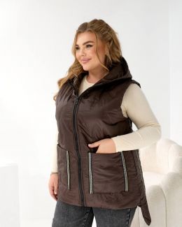 Стильний жіночий жилет – універсальний елемент осіннього гардероба. Модель виконана з плащової тканини, що надає образу вишуканості та сучасного вигляду. Прямий крій, блискавка по центру, забезпечує комфорт і свободу рухів. Об’ємний капюшон додає зручності в прохолодну погоду. Дві великі накладні кишені і по боках стрічки оздоблені декоративною блискучою тесьмою, що створюють модний акцент. Ідеально поєднується з трикотажем, светрами та джинсами для щоденного стилю.