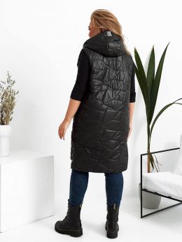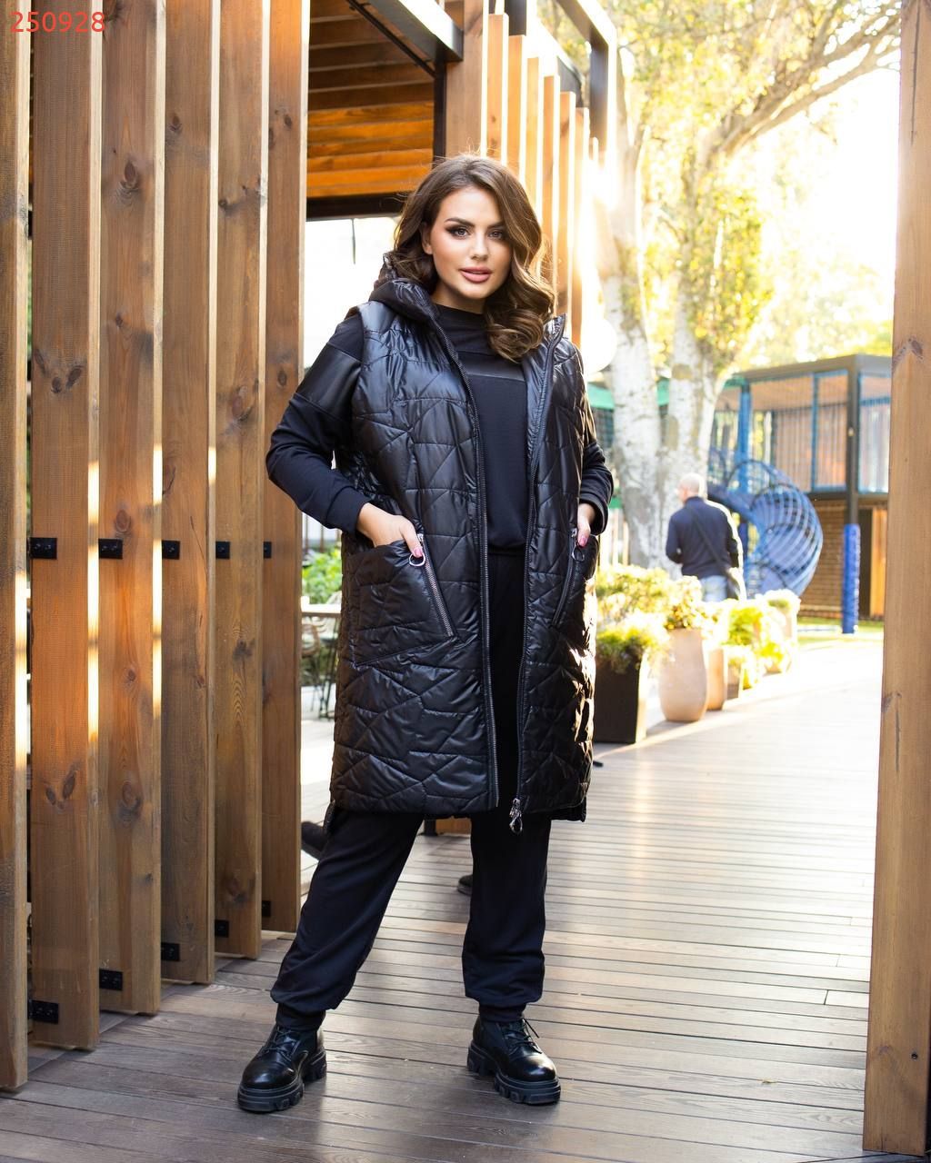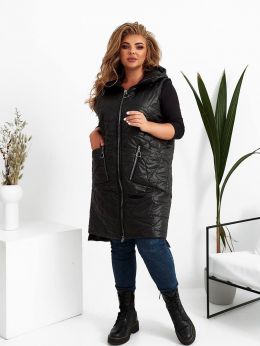 Стильна стегана жилетка прямого крою з накладними кишенями, зручний глибокий капюшон, якісна фурнітура, нашивка