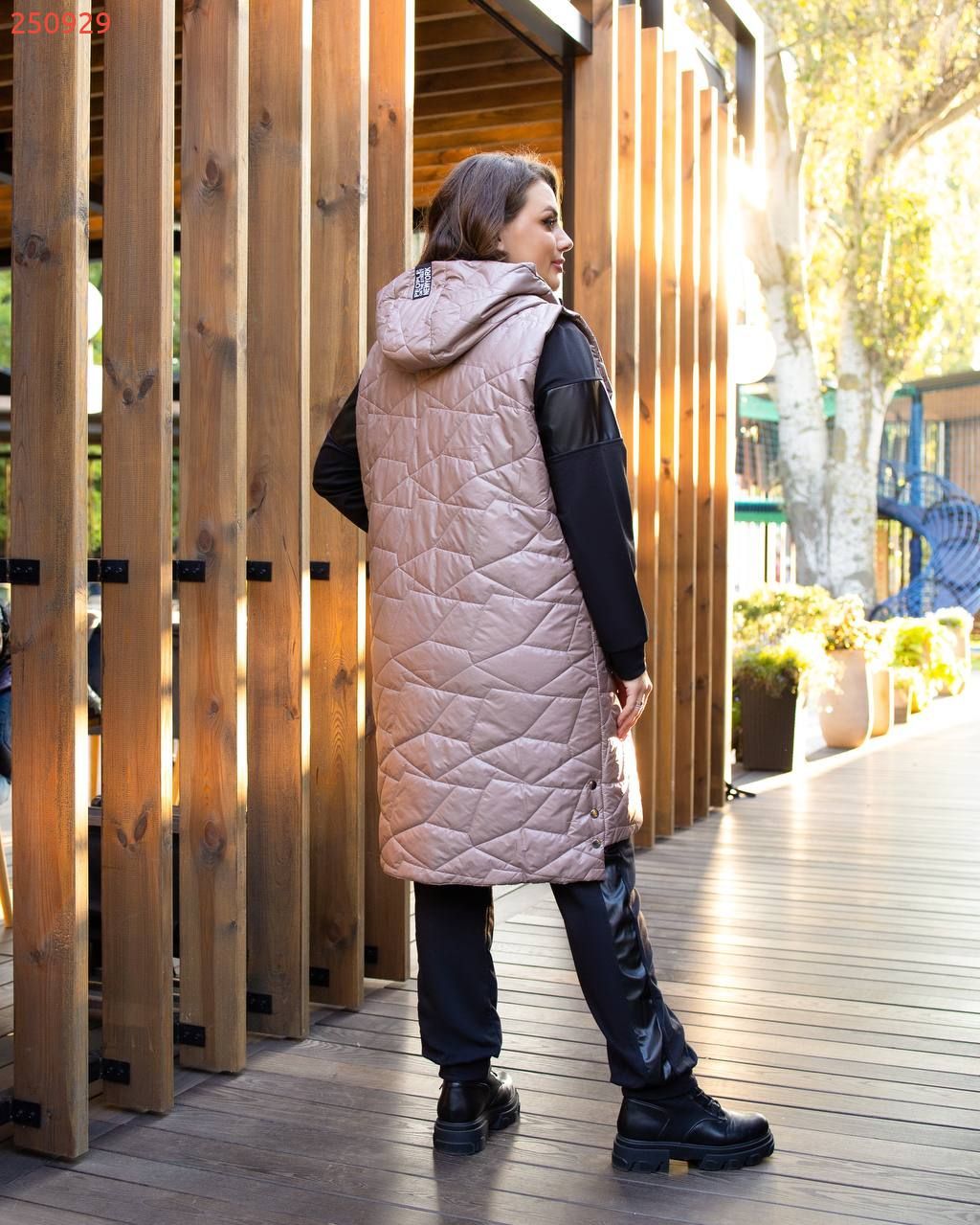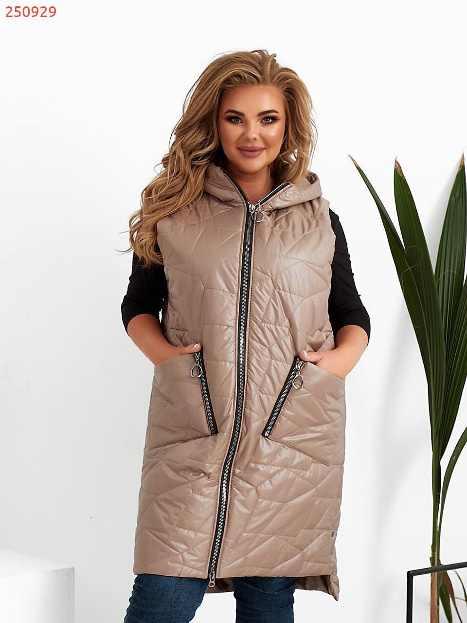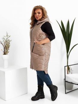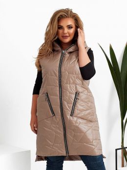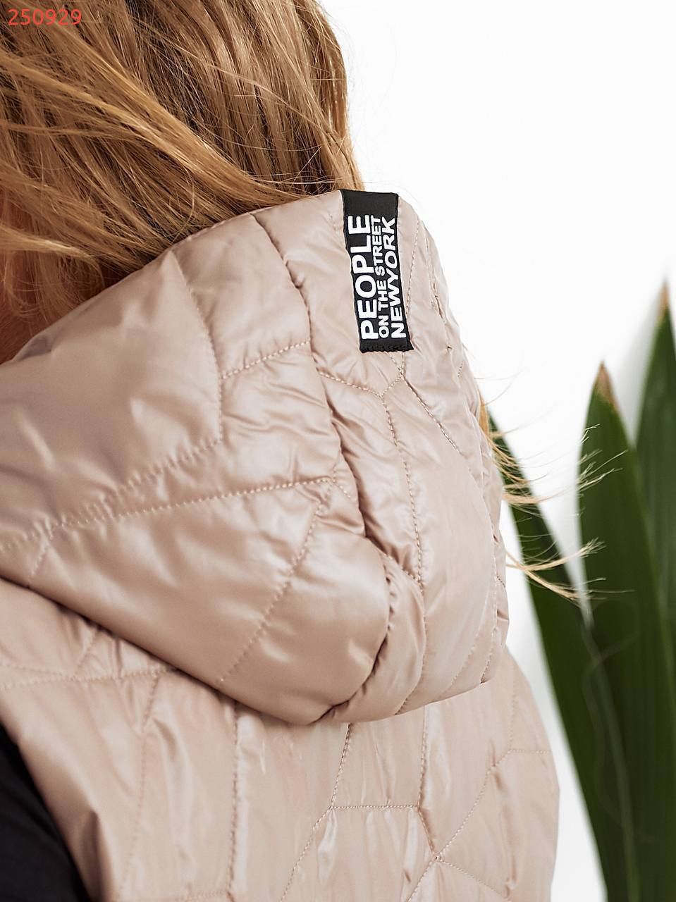 Стильна стегана жилетка прямого крою з накладними кишенями, зручний глибокий капюшон, якісна фурнітура, нашивка