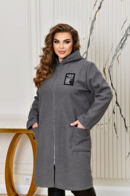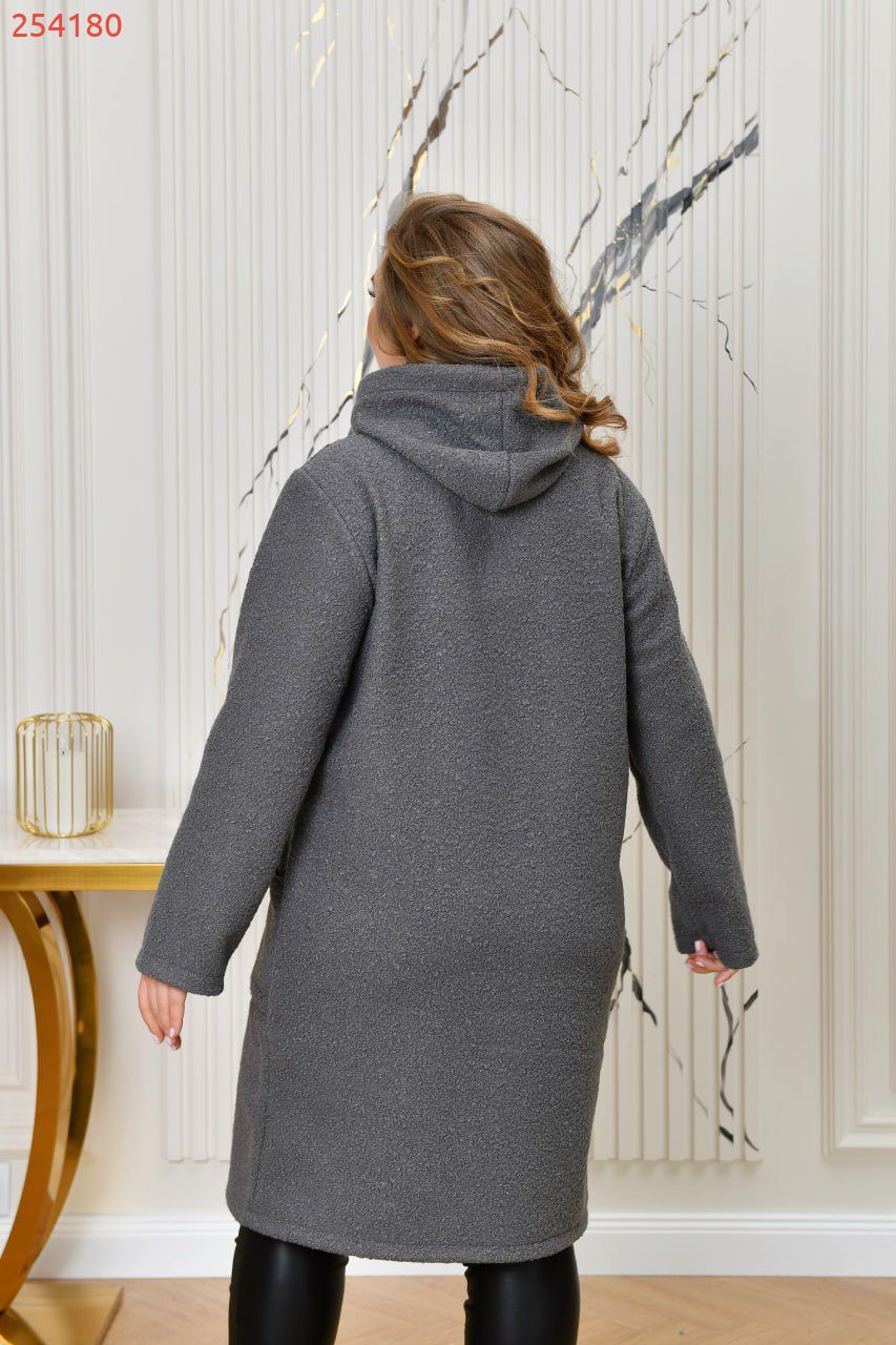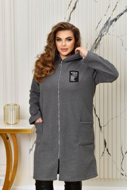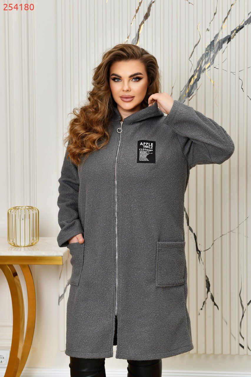 Неймовірно стильний кардиган з капюшоном, із буклє «баранець» ( розтяжність мінімальна). Силует прямий, вільний. Застібається на блискавку. Попереду оброблені дві накладні кишені. Кардиган декорований якісною нашивкою. Підкладу немає.