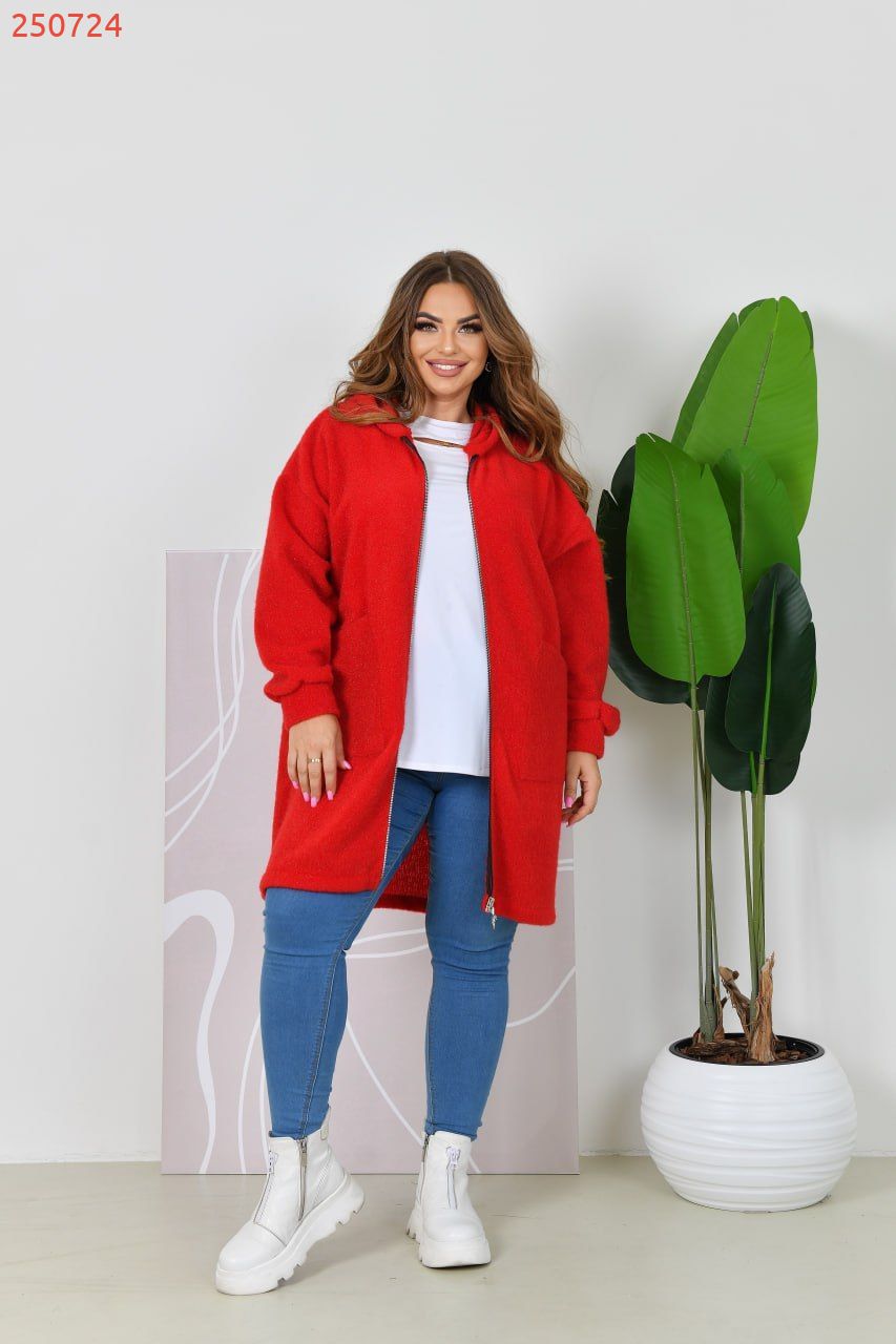 Неймовірно стильний, комфортний кардиган із м'якого ворсистого трикотажу (середня розтяжність). Кардиган має прямий вільний силует та капюшон. Лінія плеча спущена, рукав на манжеті. Застібається на блискавку. Попереду є дві накладні кишені.
