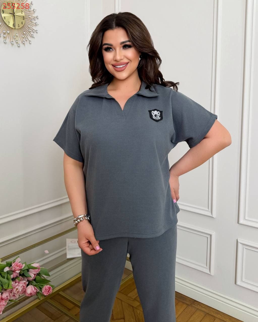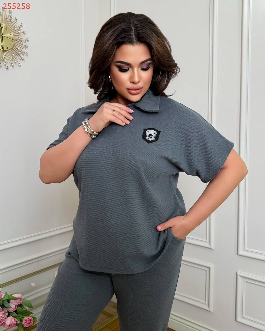 Тканина: трикотаж еластан: футболка поло у стилі оверсайз з Акс + штани з високою посадкою на еластичній гумці, з кишенями в бічних швах, низ штанів на гумці