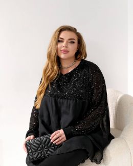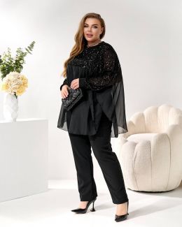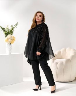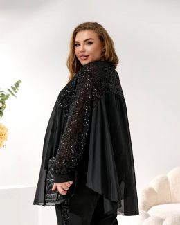 3. Накидка/Туніка: Вільний, летючий крій з шифону з оздобленням паєтками на плечах та рукавах. Можна носити поверх майки або як стильний жакет.