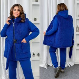 Осінній утеплений костюм трійка - жилет + худі + штани . Жилет на блискавці , комір стійка , з кишенями , пояс в комплекті . Худі на манжеті , з капюшоном . Штани з високою посадкою на гумці , з бічними кишенями , низ на манжеті .