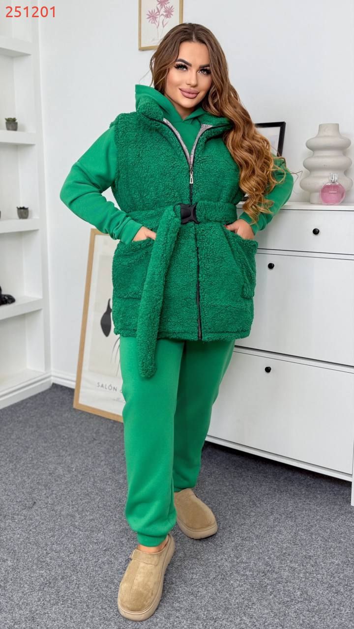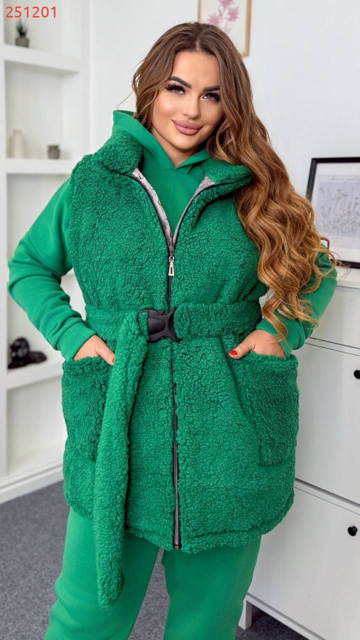 Осінній утеплений костюм трійка - жилет + худі + штани . Жилет на блискавці , комір стійка , з кишенями , пояс в комплекті . Худі на манжеті , з капюшоном . Штани з високою посадкою на гумці , з бічними кишенями , низ на манжеті .