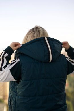 Жилет з утеплювачем 150, стьобаний , з капюшоном,на блискавці , зручні кишені з боків, декорован по низу і капюшон лампасною стрічкою і на грудях з нашивкою, підкладка плащівка.
