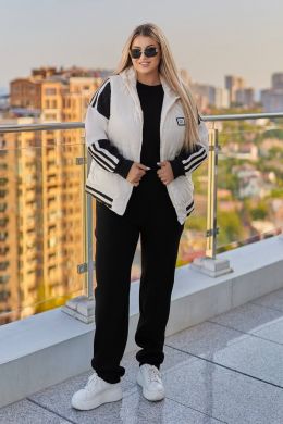 Світшот вільного крою, рукава з контрастними білими вставками прикрашені лампасною стрічкою. Штани високої посадки, з кишенями, еластичним поясом,знизу прямі.