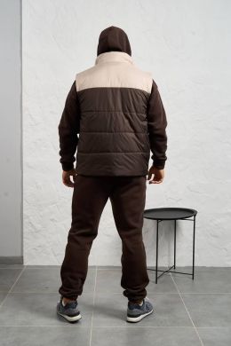Стильний чоловічий комплект для прохолодної погоди. Складається з утепленого жилета та зручного бтеплого спортивного костюма, з кишенею кенгуру, збоку прикрашен нашивкою, з капюшоном. Рукава на манжетах. Штани прямі, висока посадка з кишенями, і знизу на гумці. Жилет