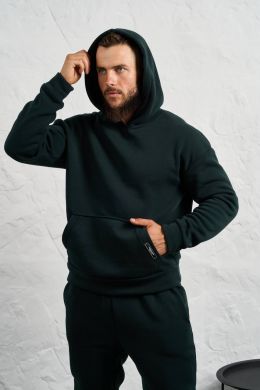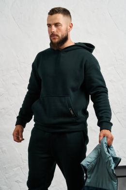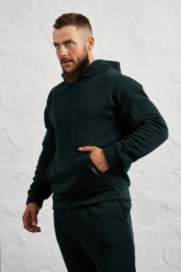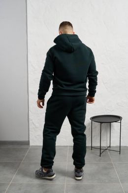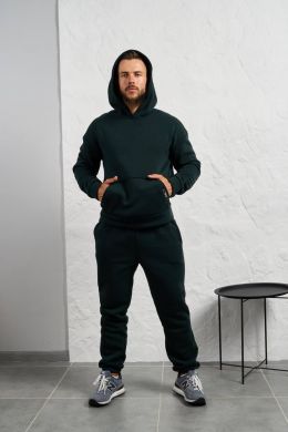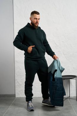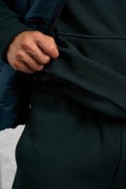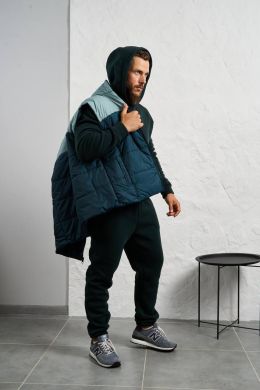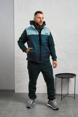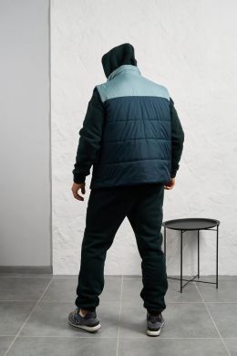 Стильний чоловічий комплект для прохолодної погоди. Складається з утепленого жилета та зручного бтеплого спортивного костюма, з кишенею кенгуру, збоку прикрашен нашивкою, з капюшоном. Рукава на манжетах. Штани прямі, висока посадка з кишенями, і знизу на гумці. Жилет