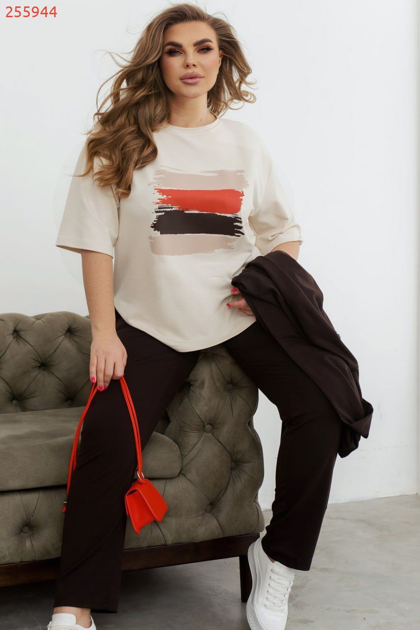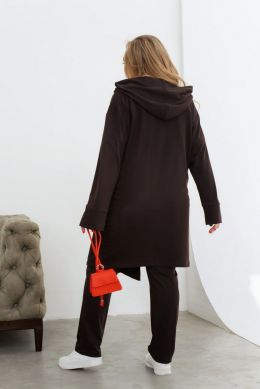 Неймовірно яскравий та стильний весняний костюм трійка, який об'єднує комфорт та модний дизайн. Футболка оверсайз крою з рукавами 3/4 та напівкруглою горловиною створює легкий та модний образ. Декоративна термоналіпка високої якості на грудях є акцентом образу. Штани прямого крою із гумкою на талії та кишенями поєднують стиль і зручність. Асиметричний кардиган із капюшоном і гудзиком по центру створює цікавий акцент. Подовжена задня частина та асиметрія передньої частини роблять цей образ ще більш вишуканим. Кишені на талії, також розміщені асиметрично, додають динаміки та оригінальності цьому весняному комплекту.