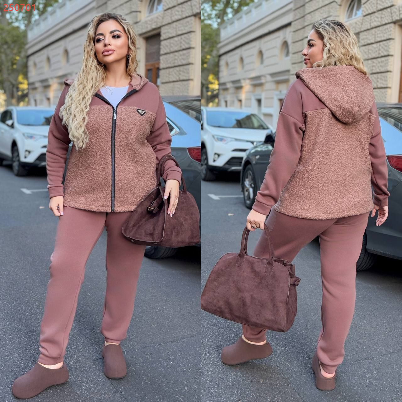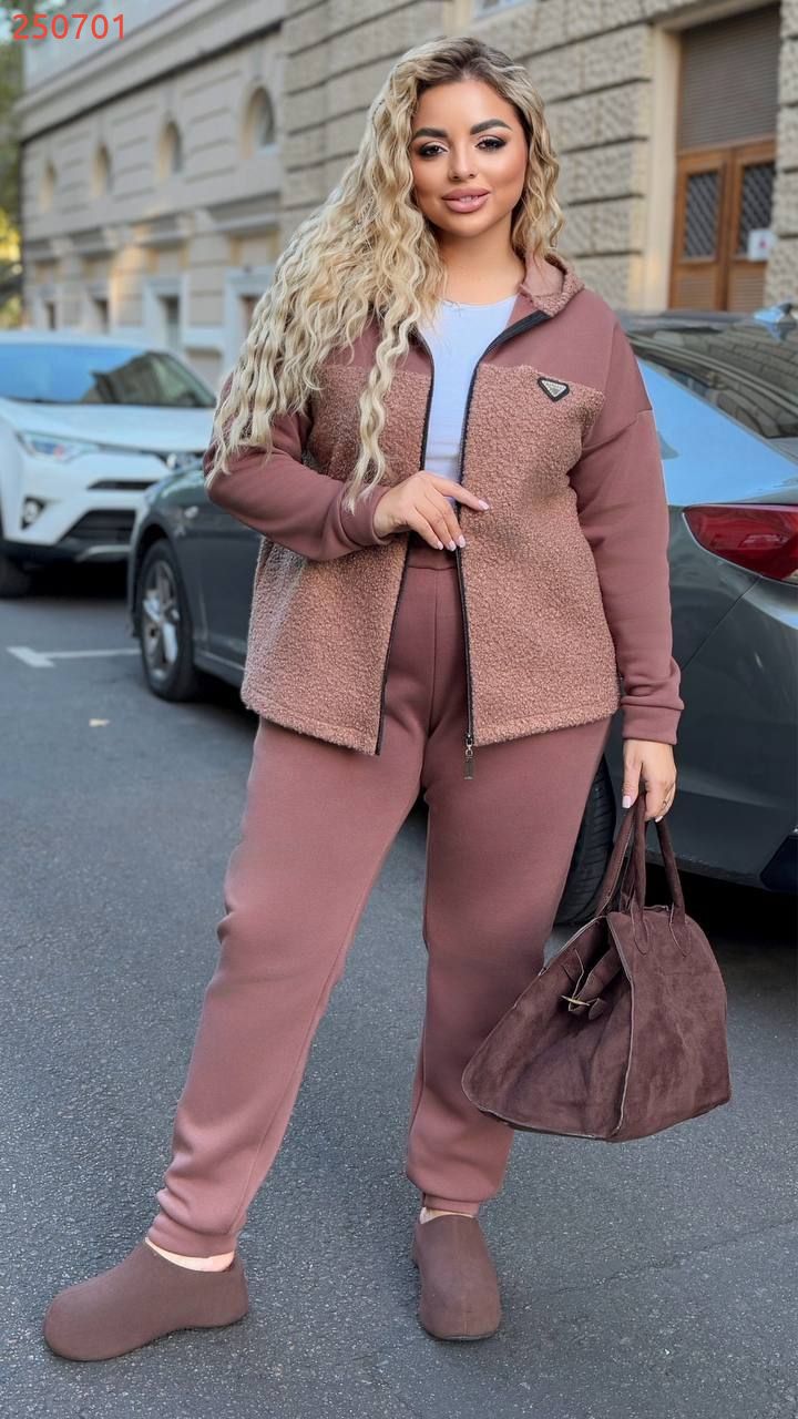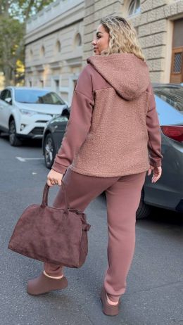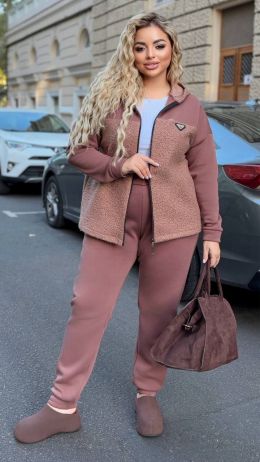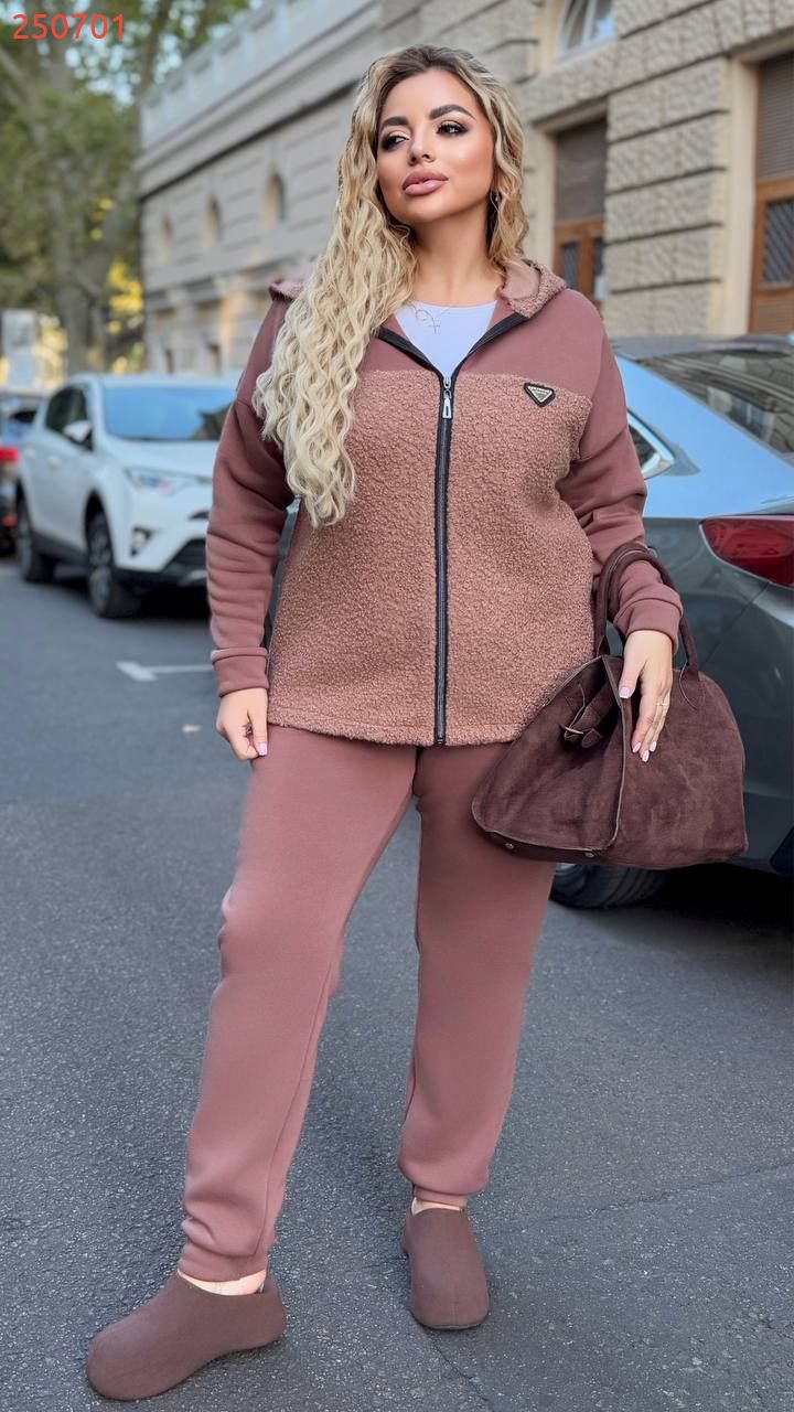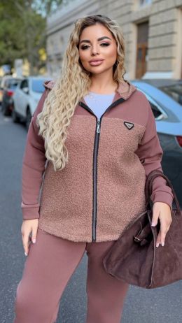 Теплий костюм на холодну пору . Комбінований худі на блискавці , з капюшоном . Штани з високою посадкою , пояс на гумці , бічні кишені .