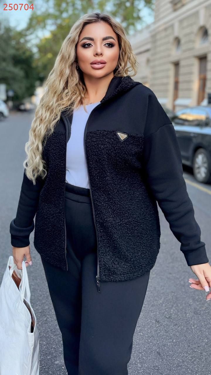 Теплий костюм на холодну пору . Комбінований худі на блискавці , з капюшоном . Штани з високою посадкою , пояс на гумці , бічні кишені .