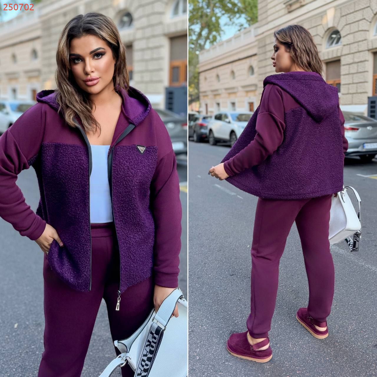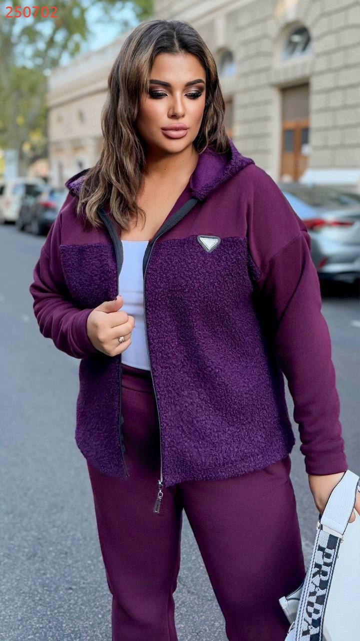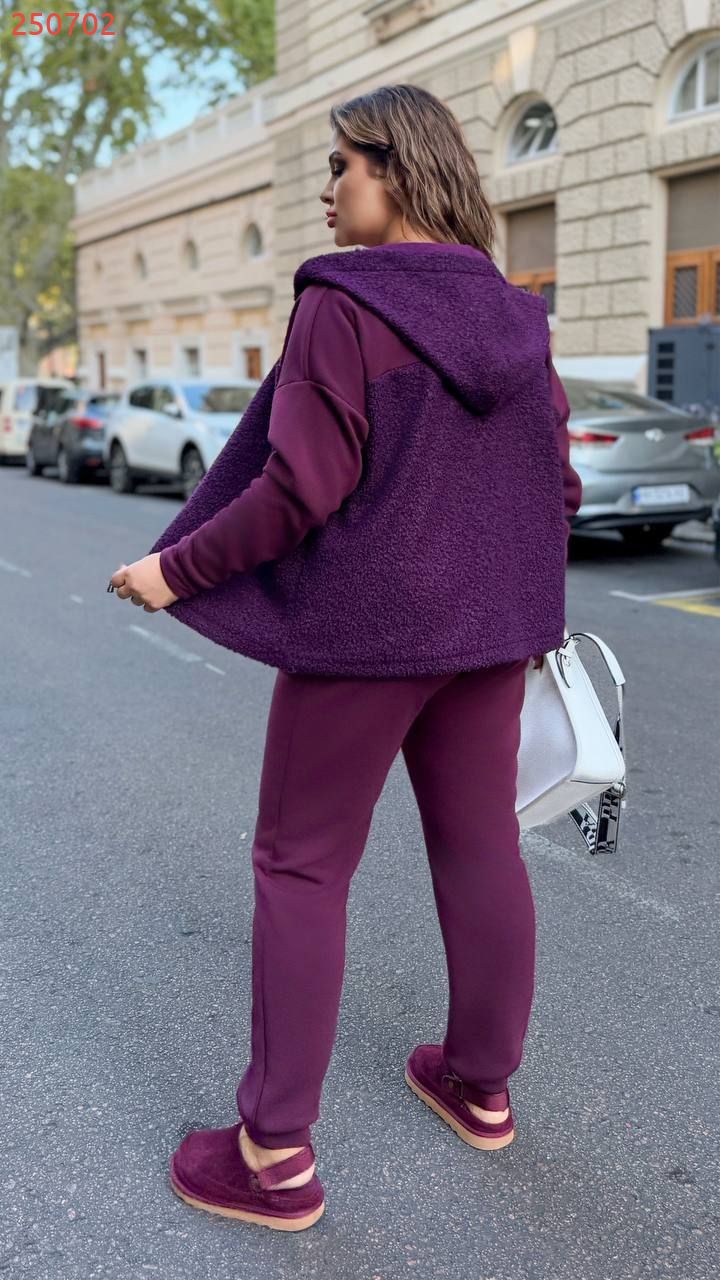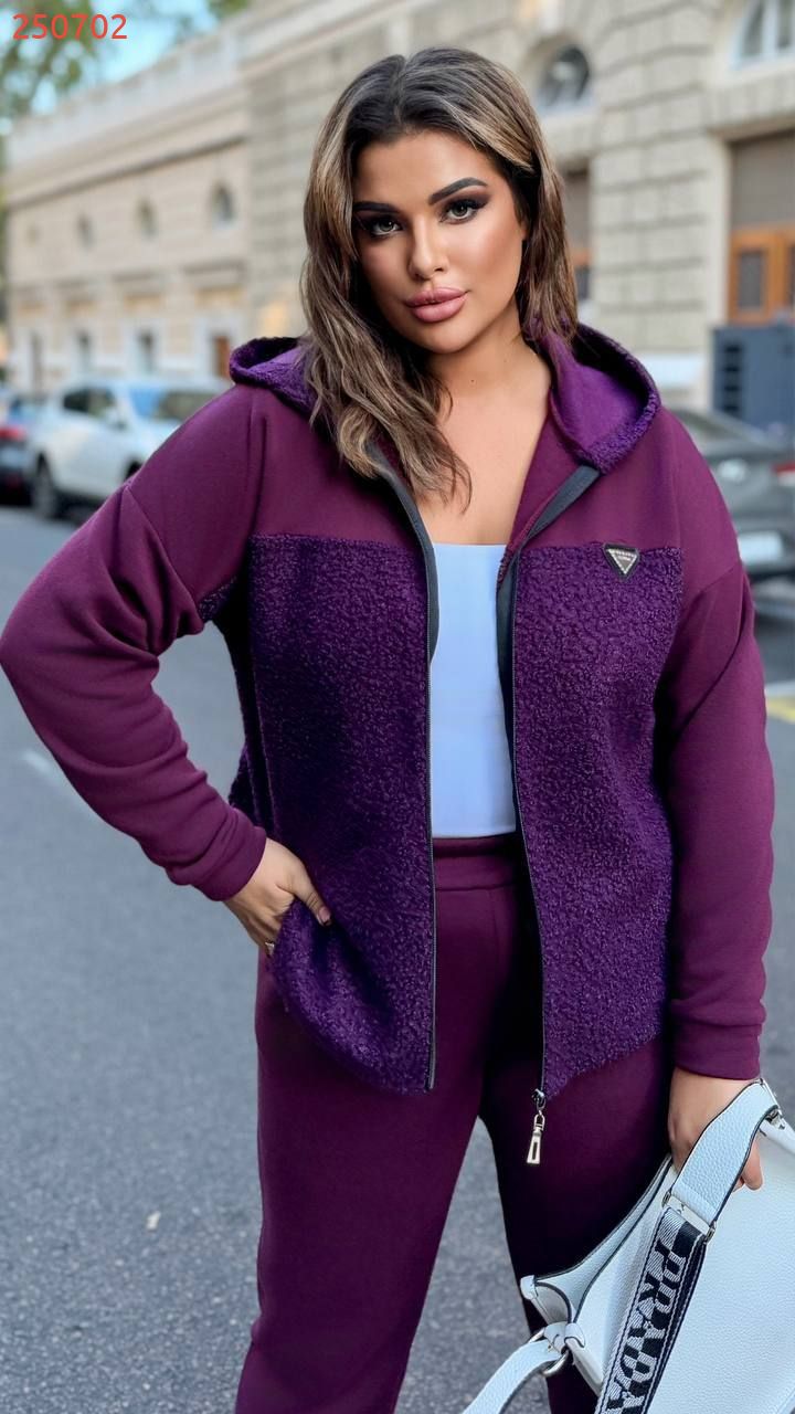 Теплий костюм на холодну пору . Комбінований худі на блискавці , з капюшоном . Штани з високою посадкою , пояс на гумці , бічні кишені .