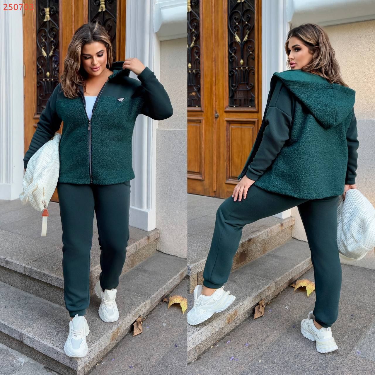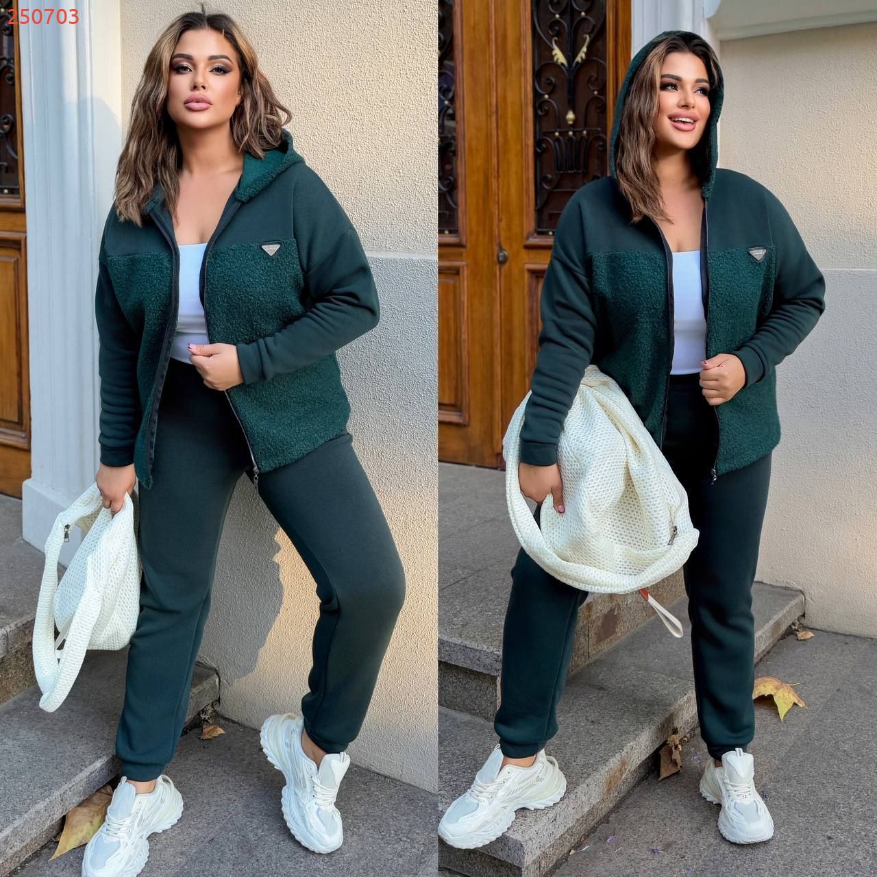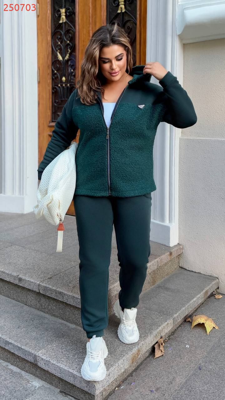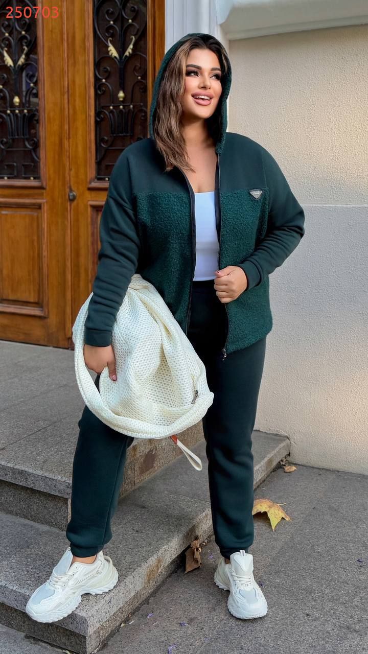 Теплий костюм на холодну пору . Комбінований худі на блискавці , з капюшоном . Штани з високою посадкою , пояс на гумці , бічні кишені .