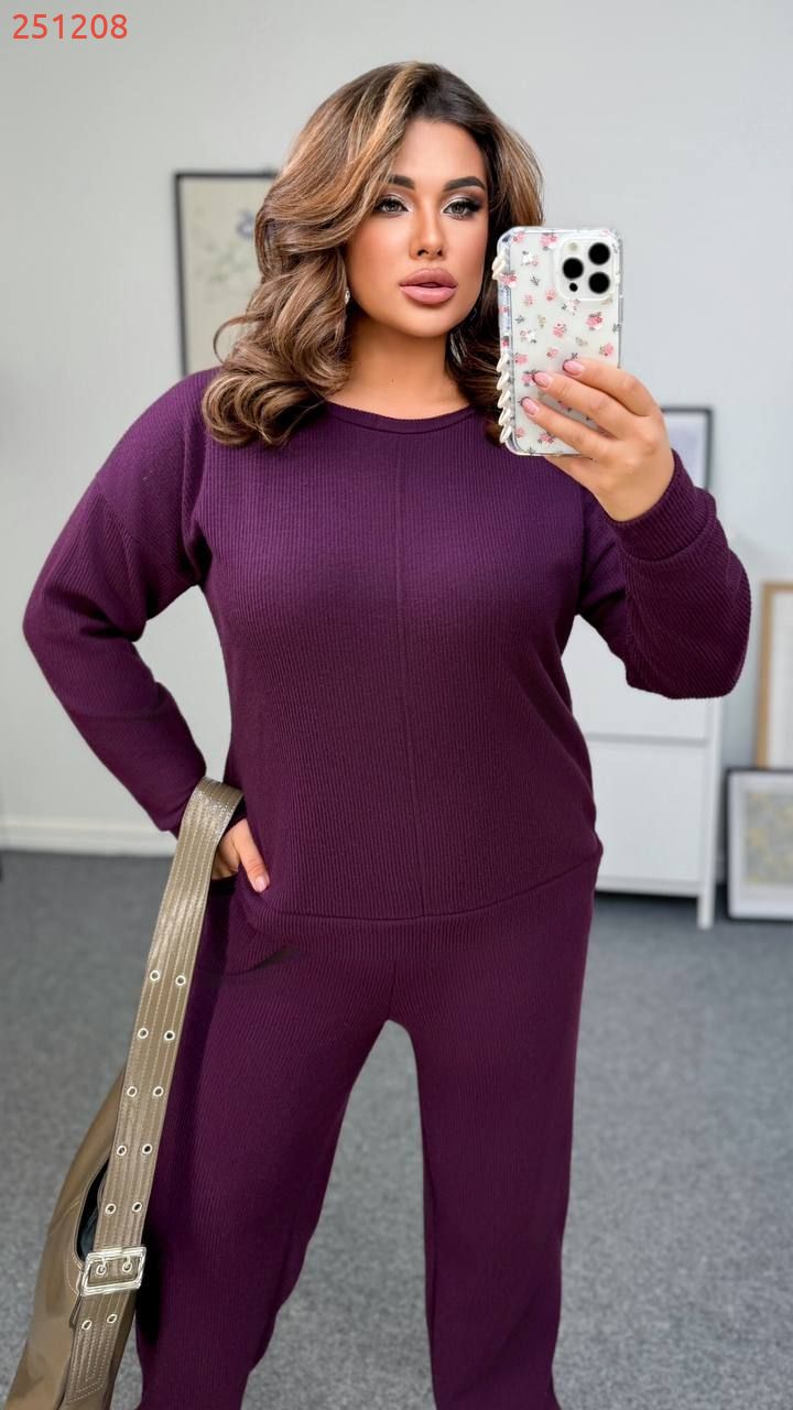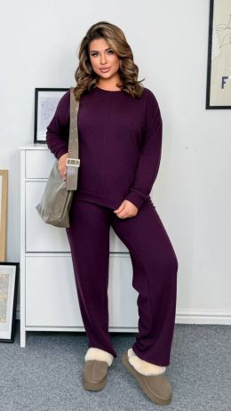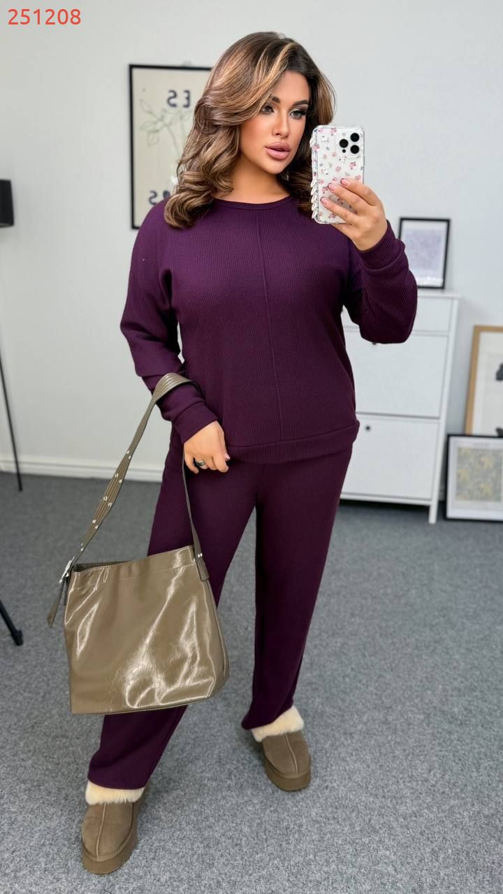 Теплий костюм на холодну пору - кофта + штани . Кофта прямого покрою , на манжеті . Широкі штани з високою посадкою на гумці .