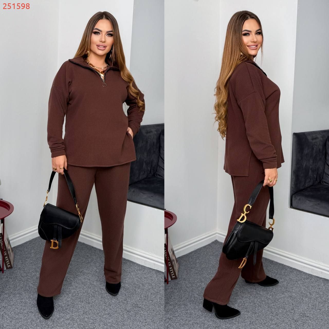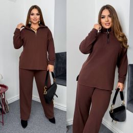 Теплий костюм на холодну пору - кофта + штани . Кофта подовжена прямого покрою , комір стійка на блискавці . Широкі штани з високою посадкою на гумці .