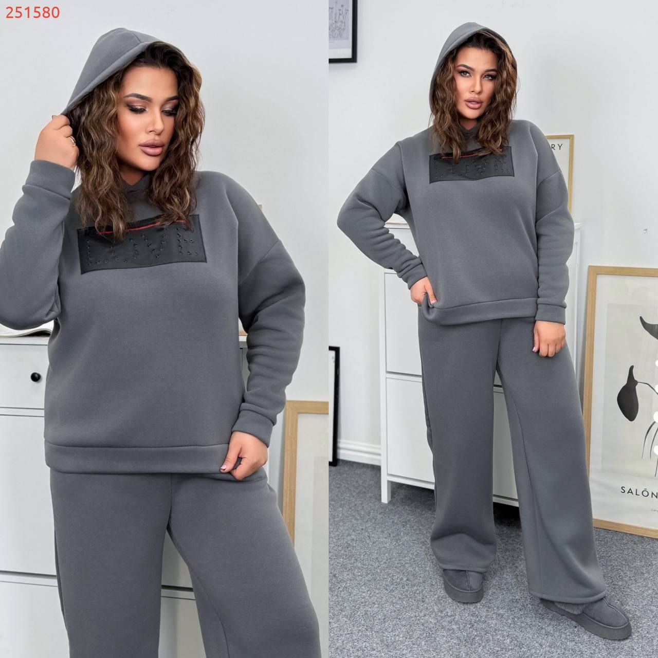 Теплий костюм на холодну пору . Світшот на манжеті , з капюшоном . Широкі штани з високою посадкою , пояс на гумці , бічні кишені .