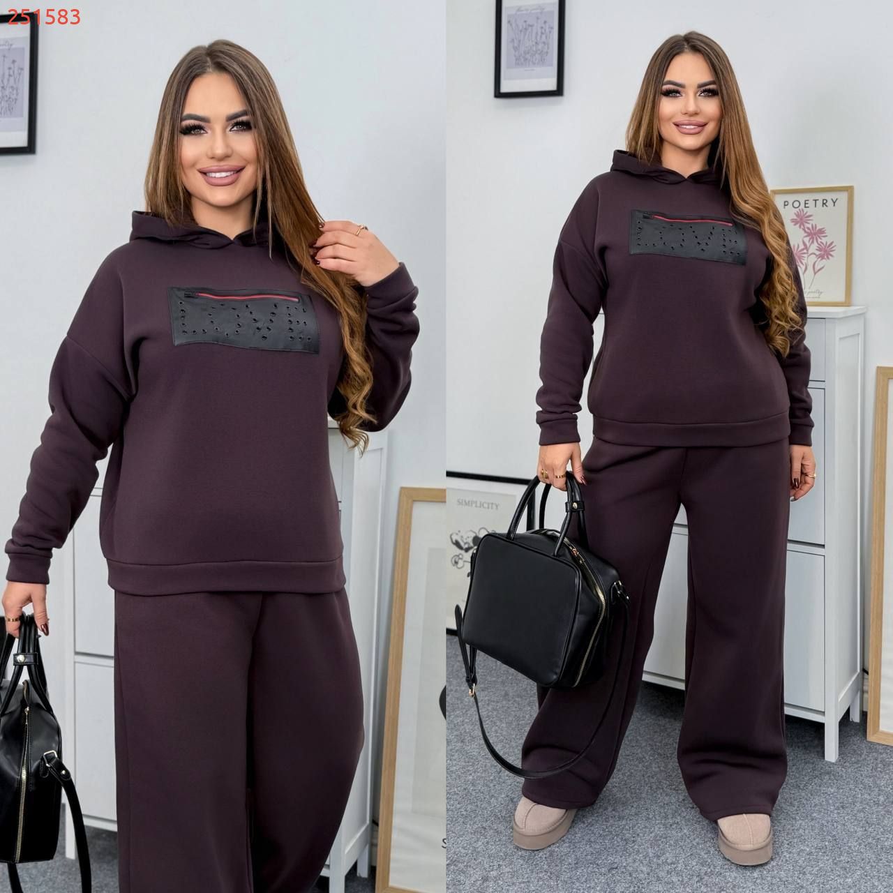 Теплий костюм на холодну пору . Світшот на манжеті , з капюшоном . Широкі штани з високою посадкою , пояс на гумці , бічні кишені .