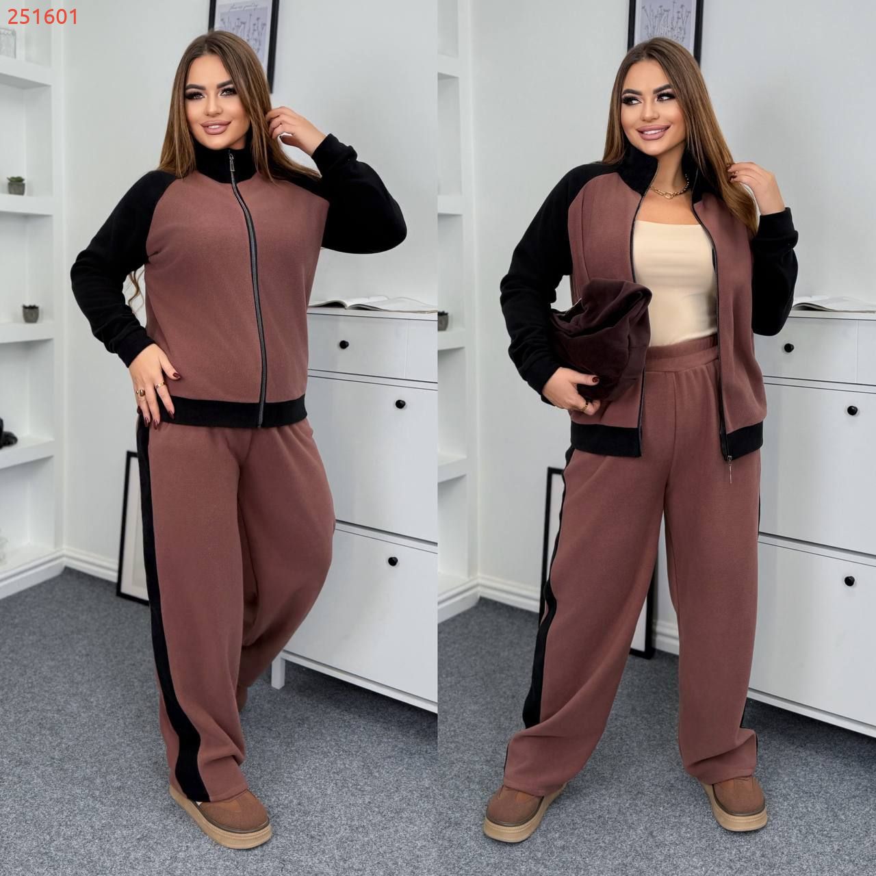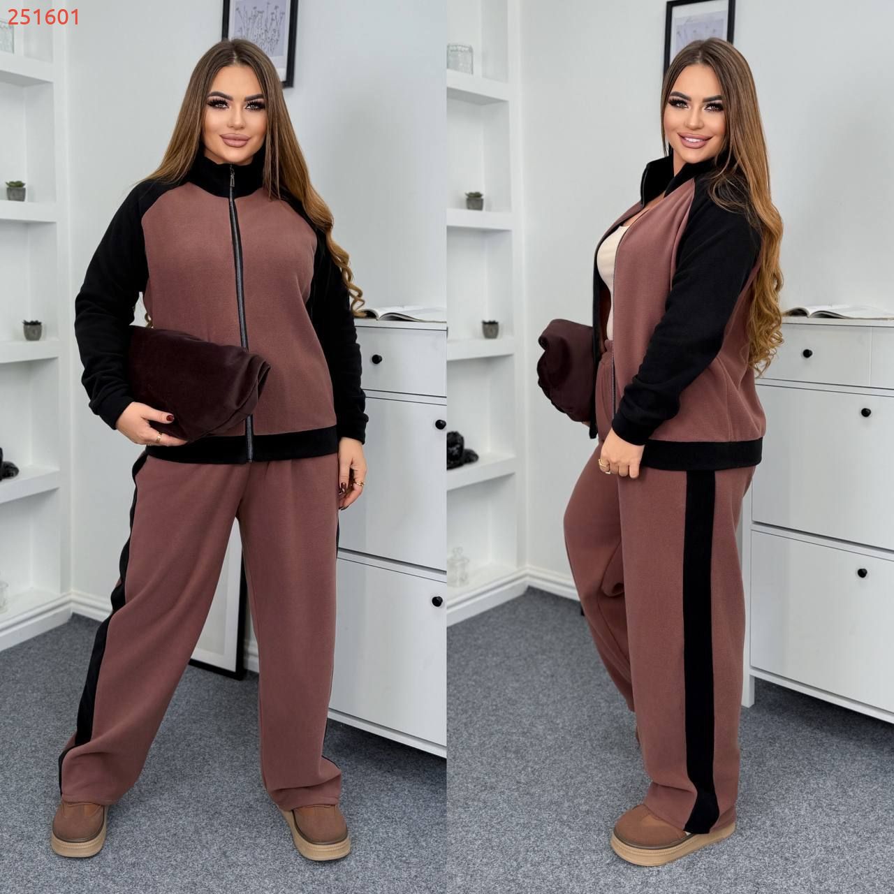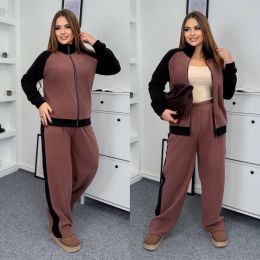 Теплий костюм на холодну пору . Комбінований бомбер на блискавці , з стійкою . Штани з високою посадкою , пояс на гумці , з ломпасом , бічні кишені .