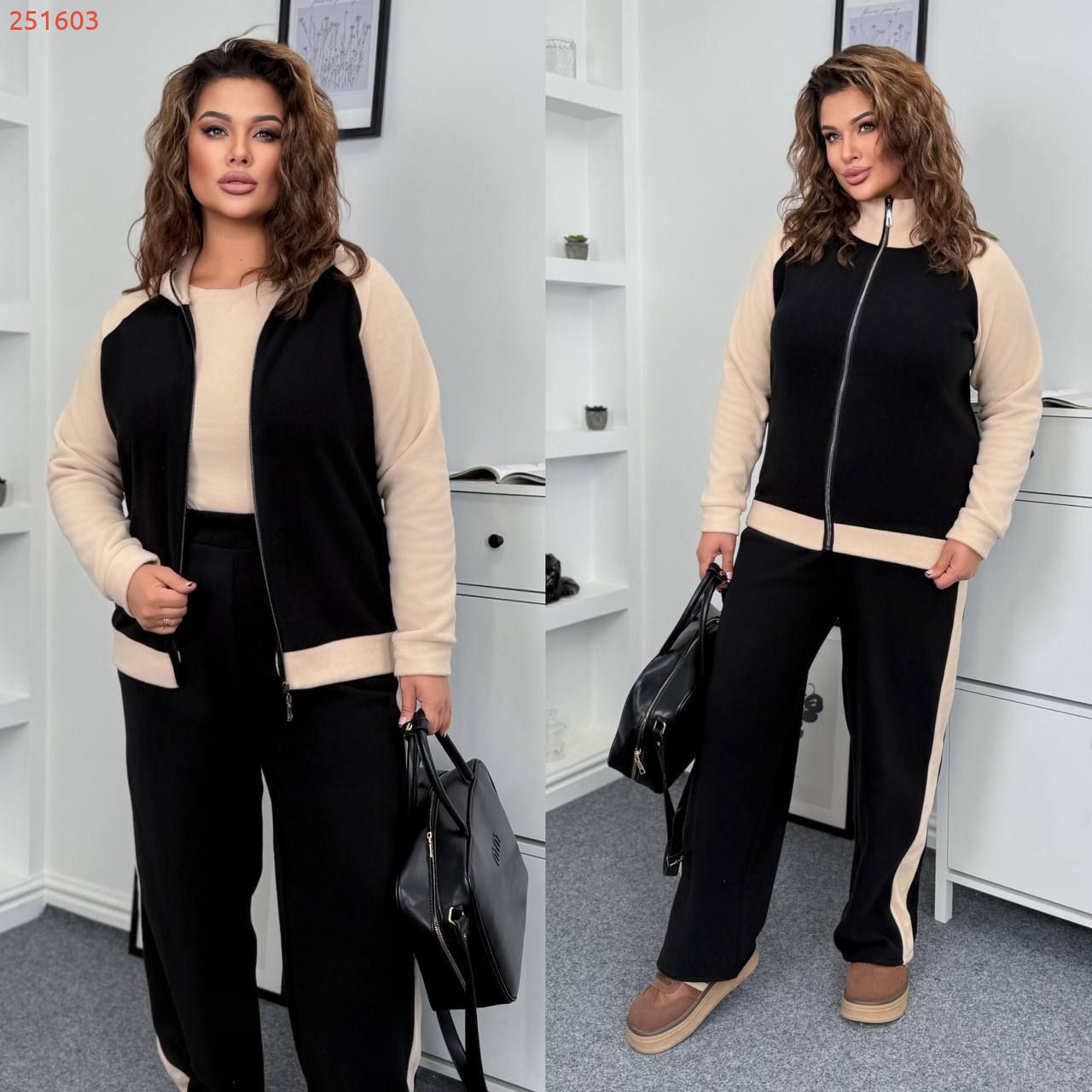 Теплий костюм на холодну пору . Комбінований бомбер на блискавці , з стійкою . Штани з високою посадкою , пояс на гумці , з ломпасом , бічні кишені .