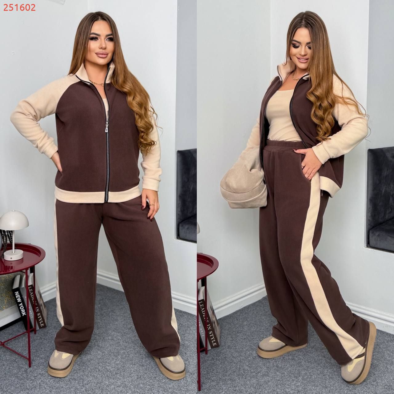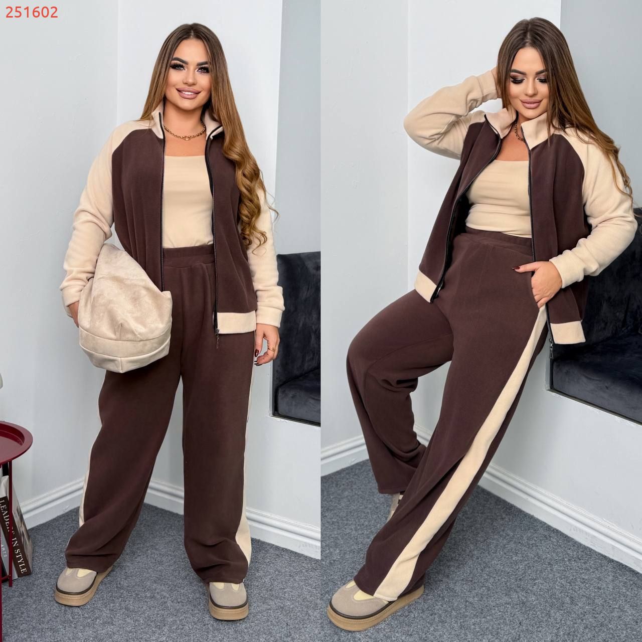 Теплий костюм на холодну пору . Комбінований бомбер на блискавці , з стійкою . Штани з високою посадкою , пояс на гумці , з ломпасом , бічні кишені .