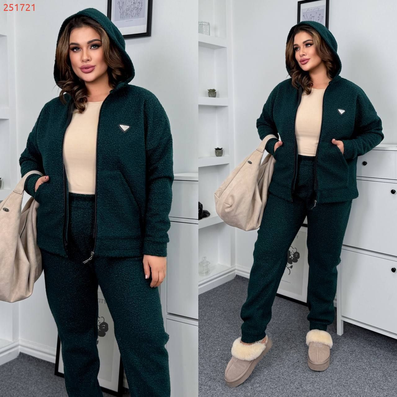 Довжина штанів : 110 см. Теплий , мягенький костюм двійка . Кофта з капюшоном, на блискавці , кишені кенгуру . Штани з високою посадкою , пояс на гумці .