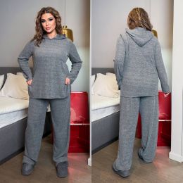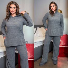 Довжина штанів : 106 см. Стильний костюм двійка . Штани з високою посадкою , пояс на гумці . Кофта прямого покрою з бічними розрізами , та капюшоном .