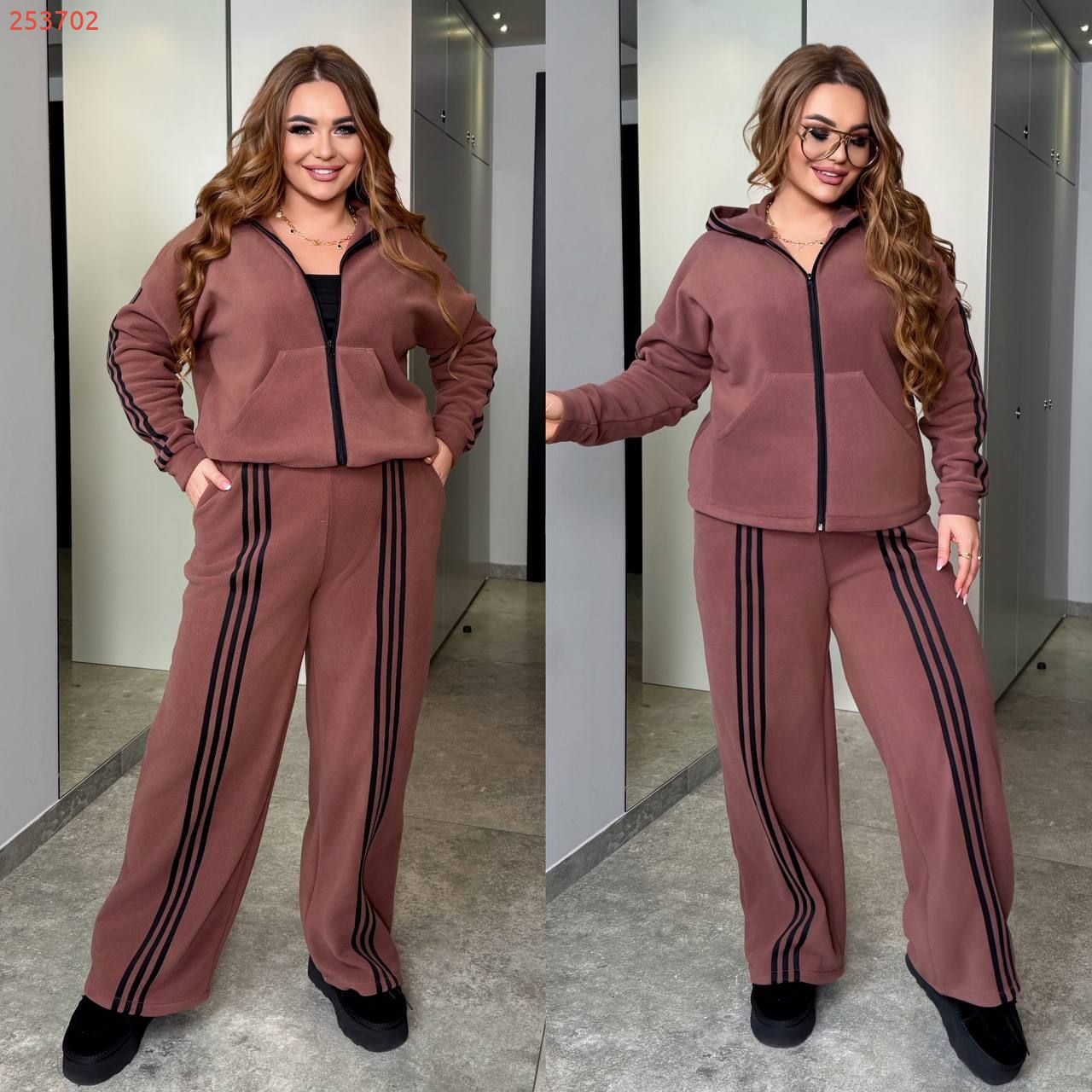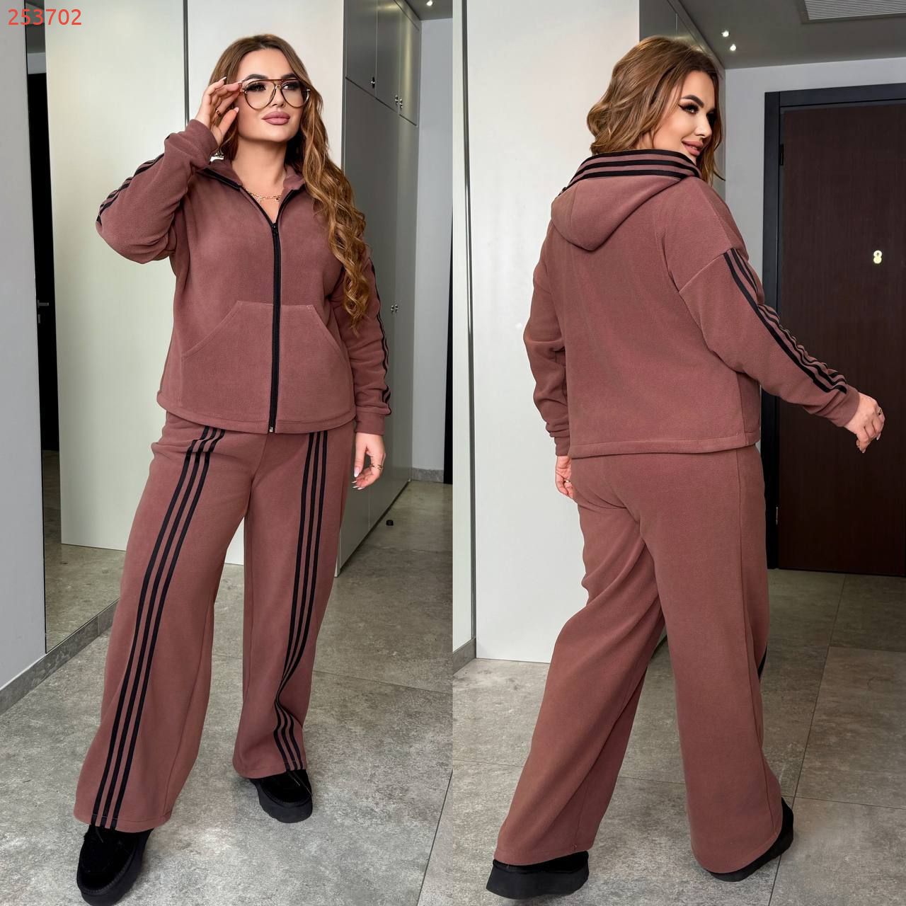 Довжина штанів : 110 см. Штани з ломпасом , з високою посадкою , пояс на гумці , бічні кишені . Кофта з ломпасом прямого покрою , низ на фіксаторі , з капюшоном , на блискавці , кишені кенгуру .