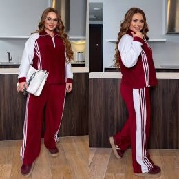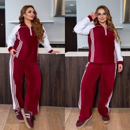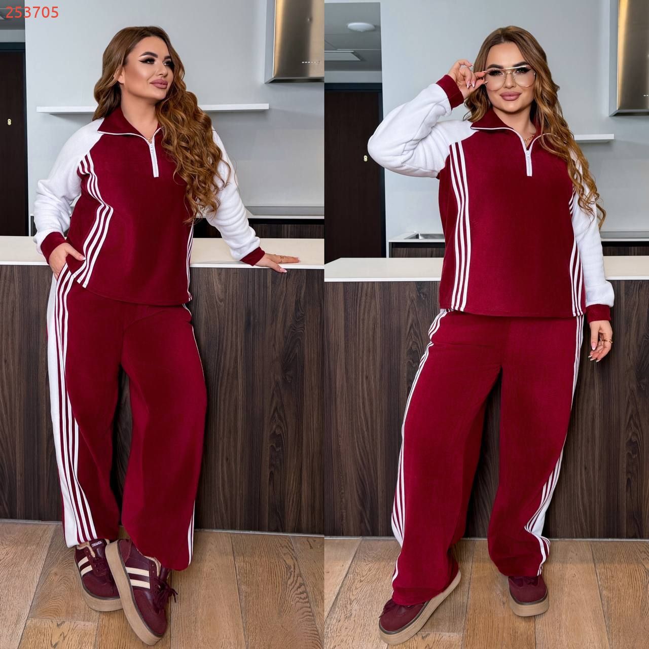 Довжина штанів : 110 см. Штани з ломпасом , з високою посадкою , пояс на гумці , бічні кишені , низ на фіксаторі . Кофта з ломпасом прямого покрою , з коміром на блискавці , рукав реглан .