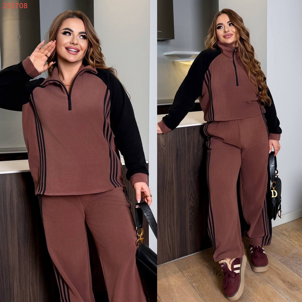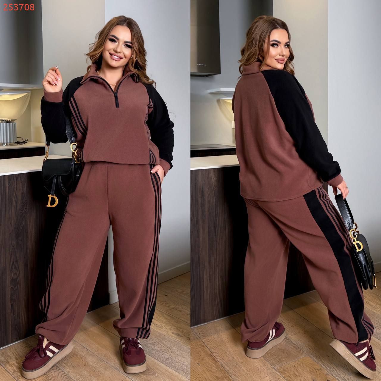 Довжина штанів : 110 см. Штани з ломпасом , з високою посадкою , пояс на гумці , бічні кишені , низ на фіксаторі . Кофта з ломпасом прямого покрою , з коміром на блискавці , рукав реглан .