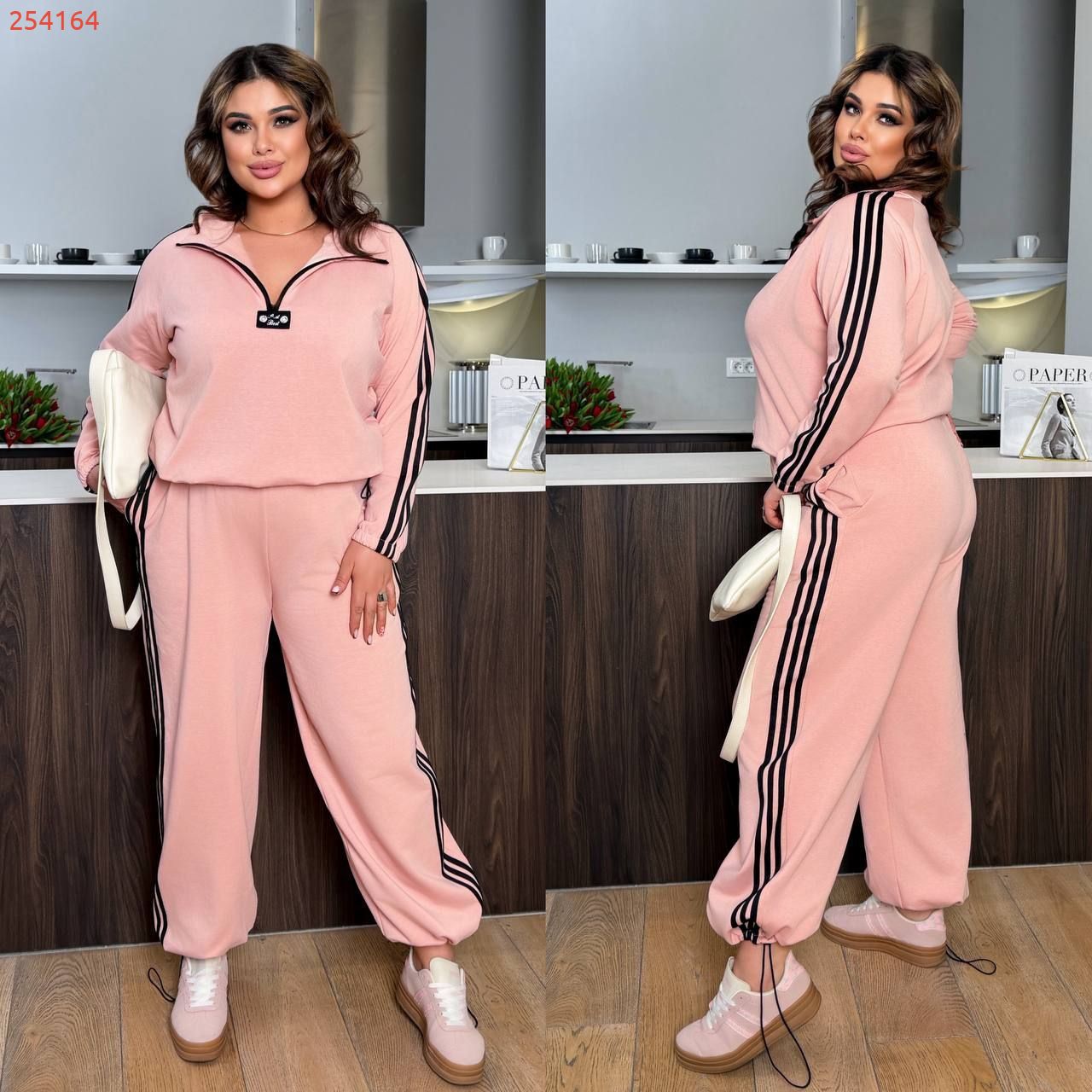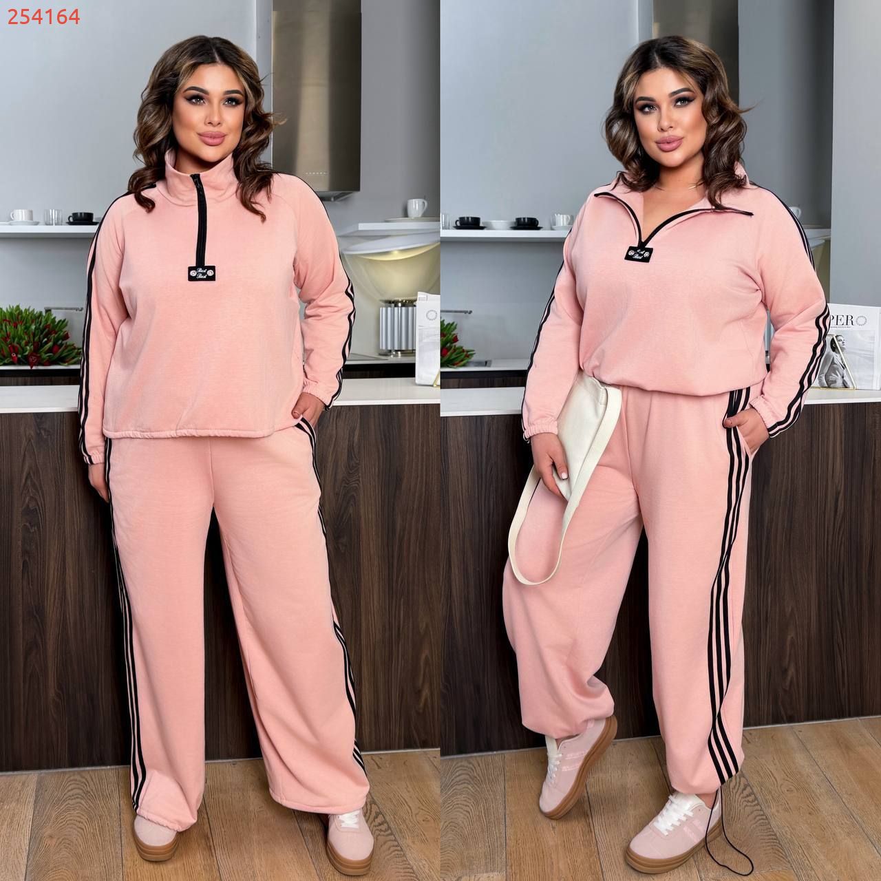 Довжина штанів : 106 см Штани з ломпасом , з високою посадкою , пояс на гумці , бічні кишені , низ на фіксаторі . Кофта прямого покрою , з коміром на блискавці , рукав з ломпасом , низ на фіксаторі .