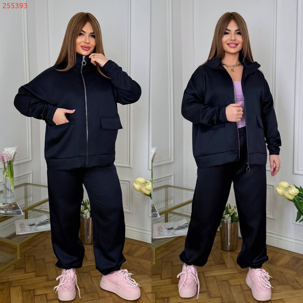 Довжина джогерів : 106 см. Джогери з високою посадкою , пояс на гумці , бічні кишені , низ на гумці . Бомбер прямого покрою , з кишенями , комір стійка , на блискавці .