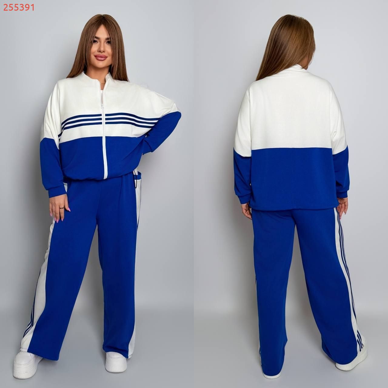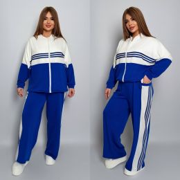 Довжина штанів : 106 см Штани з ломпасом , з високою посадкою , пояс на гумці , бічні кишені . Кофта прямого покрою , з ломпасом , низ на фіксаторі , на блискавці .