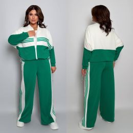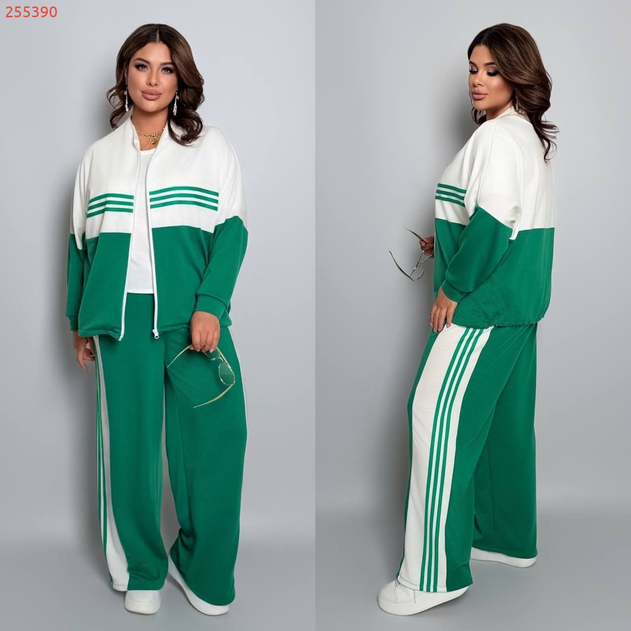 Довжина штанів : 106 см Штани з ломпасом , з високою посадкою , пояс на гумці , бічні кишені . Кофта прямого покрою , з ломпасом , низ на фіксаторі , на блискавці .