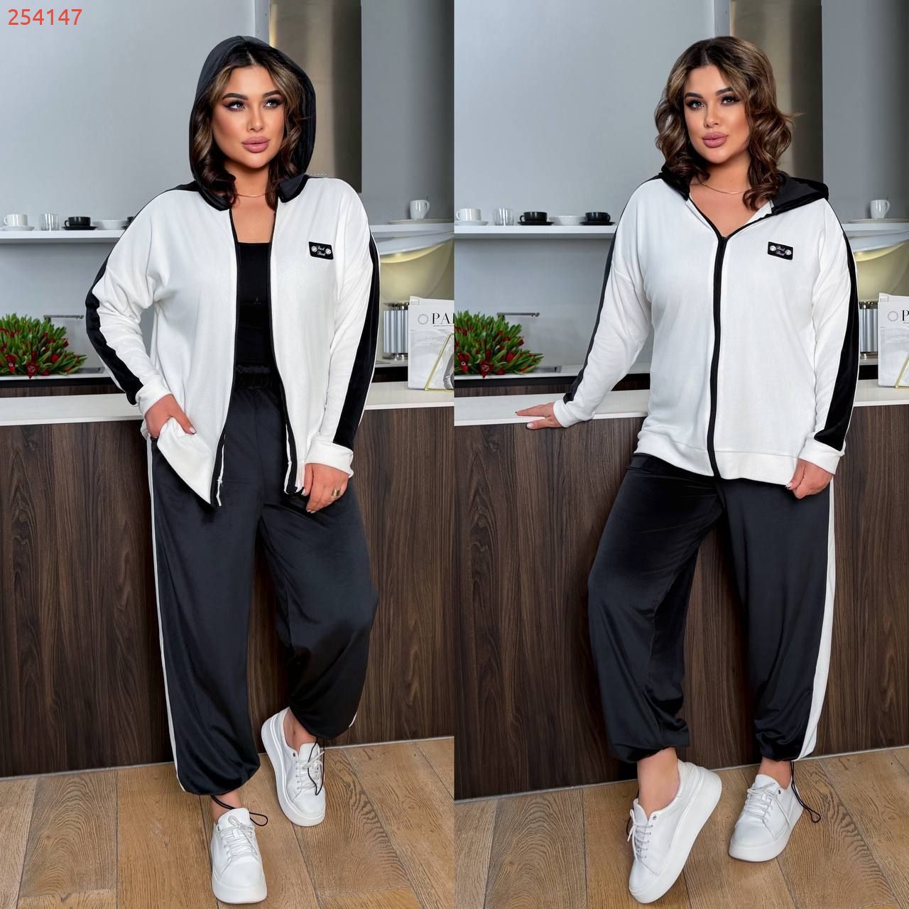 Довжина штанів : 106 см Штани з високою посадкою , пояс на гумці , бічні ломпаси , бічні кишені , низ на фіксаторі . Кофта прямого покрою , на блискавці , з капюшоном , рукав з ломпасом .