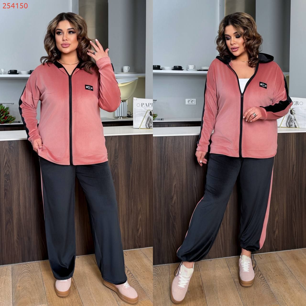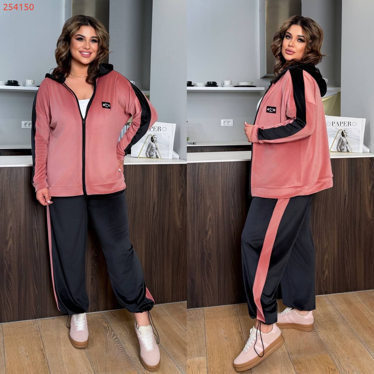 Довжина штанів : 106 см Штани з високою посадкою , пояс на гумці , бічні ломпаси , бічні кишені , низ на фіксаторі . Кофта прямого покрою , на блискавці , з капюшоном , рукав з ломпасом .