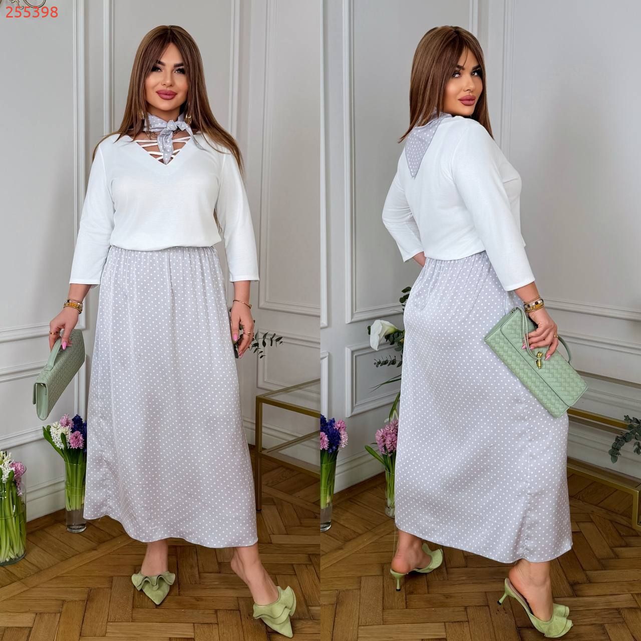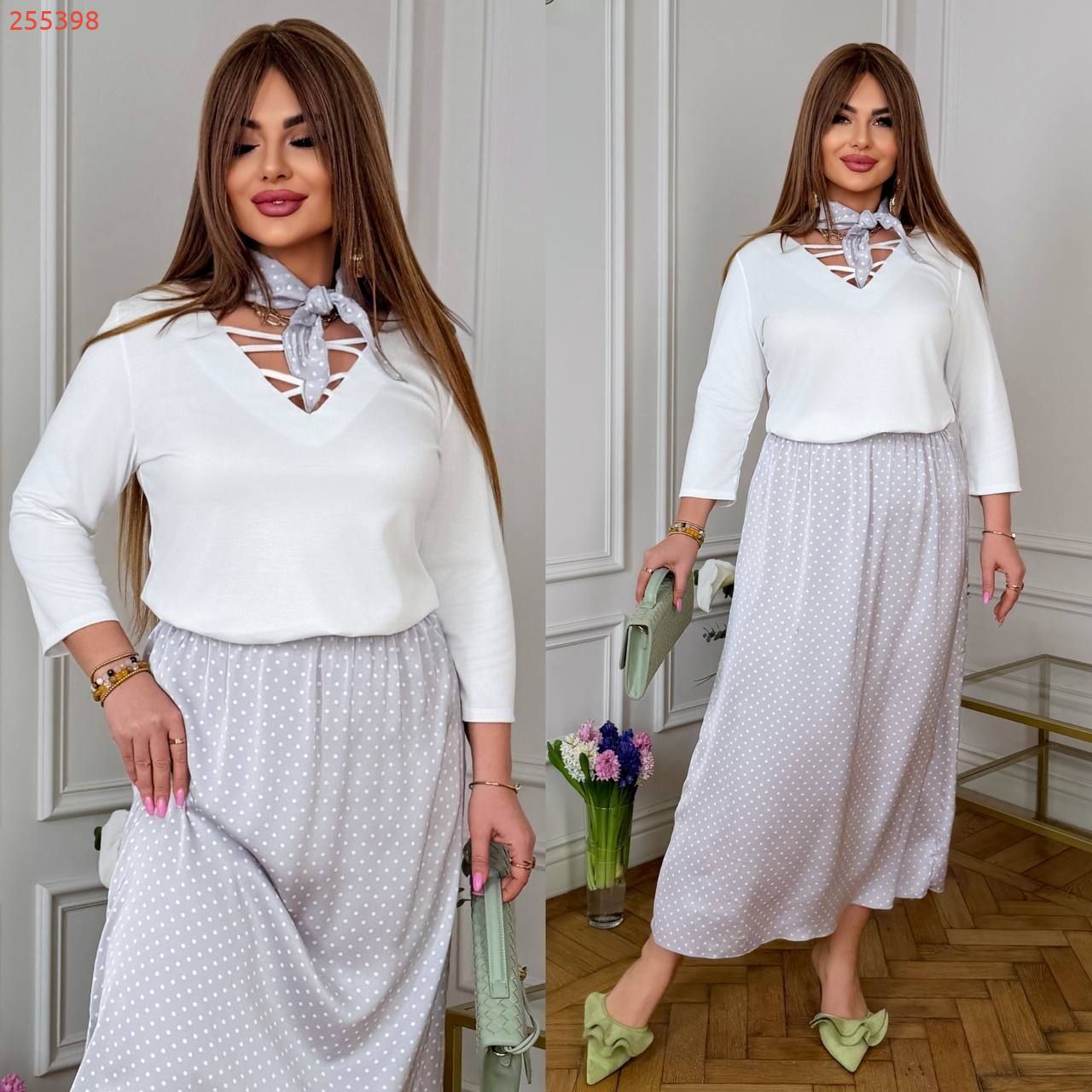Спідниця покрою трапеція з високою посадкою , пояс на гумці . Кофта з шнурком прямого покрою