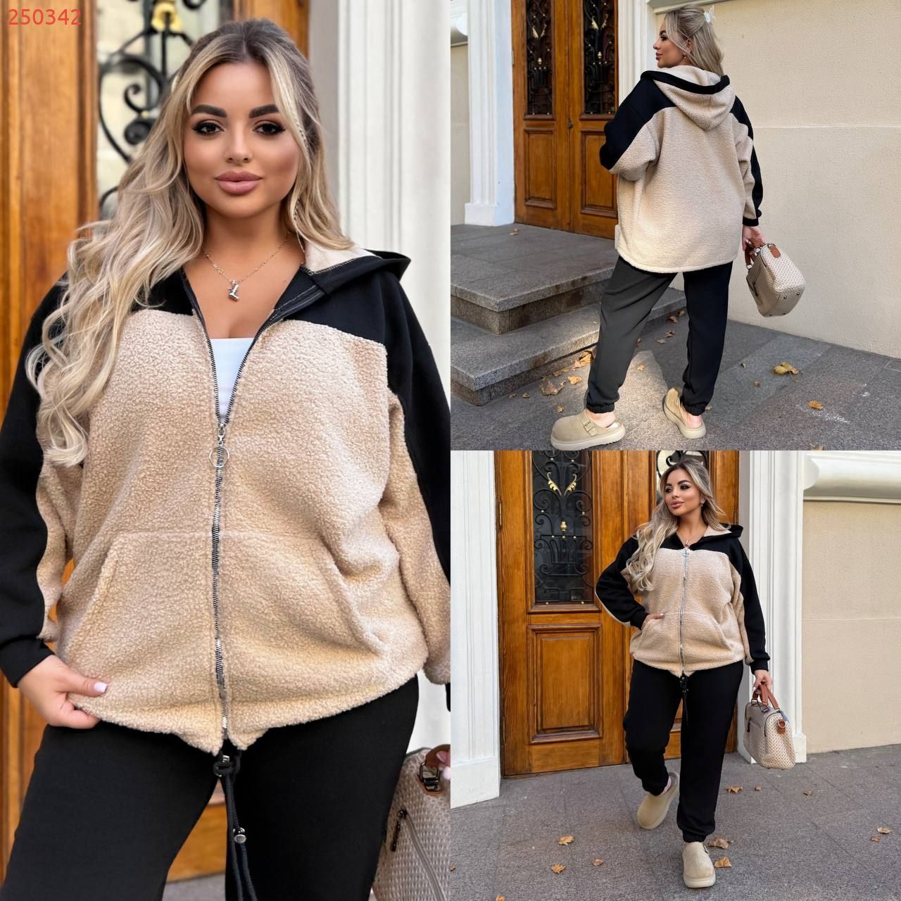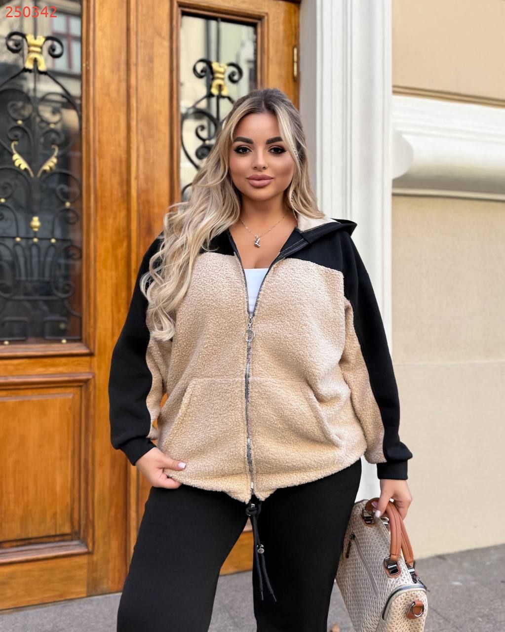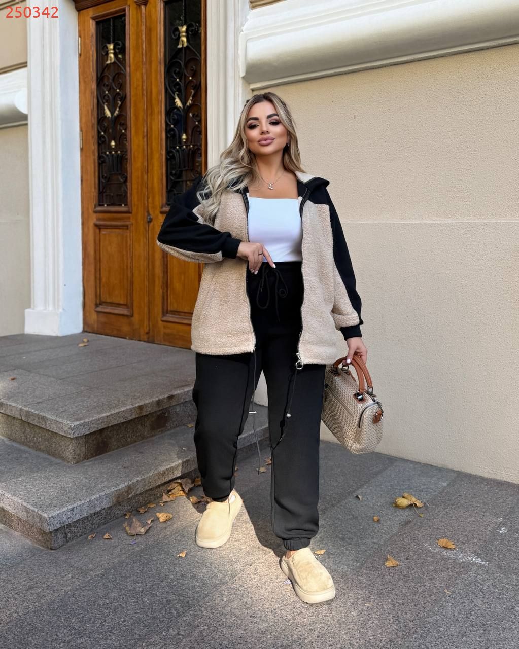 Тканина: Якісний мʼякий дуже теплий еко баранчик на флісі, комбінований чорною Хб стрейч триниткою на флісі. Добра розтяжність.