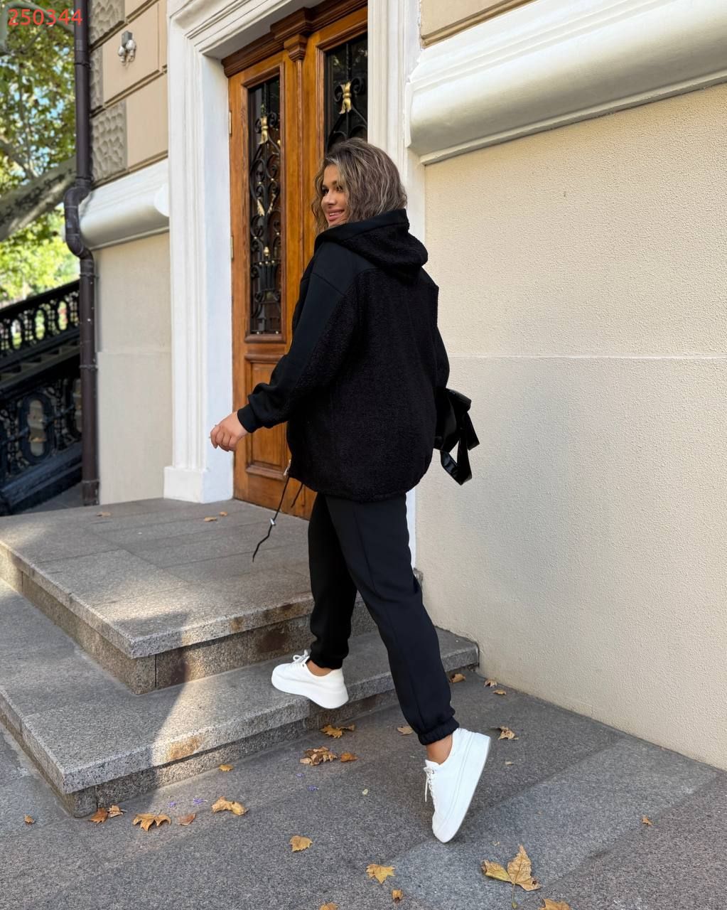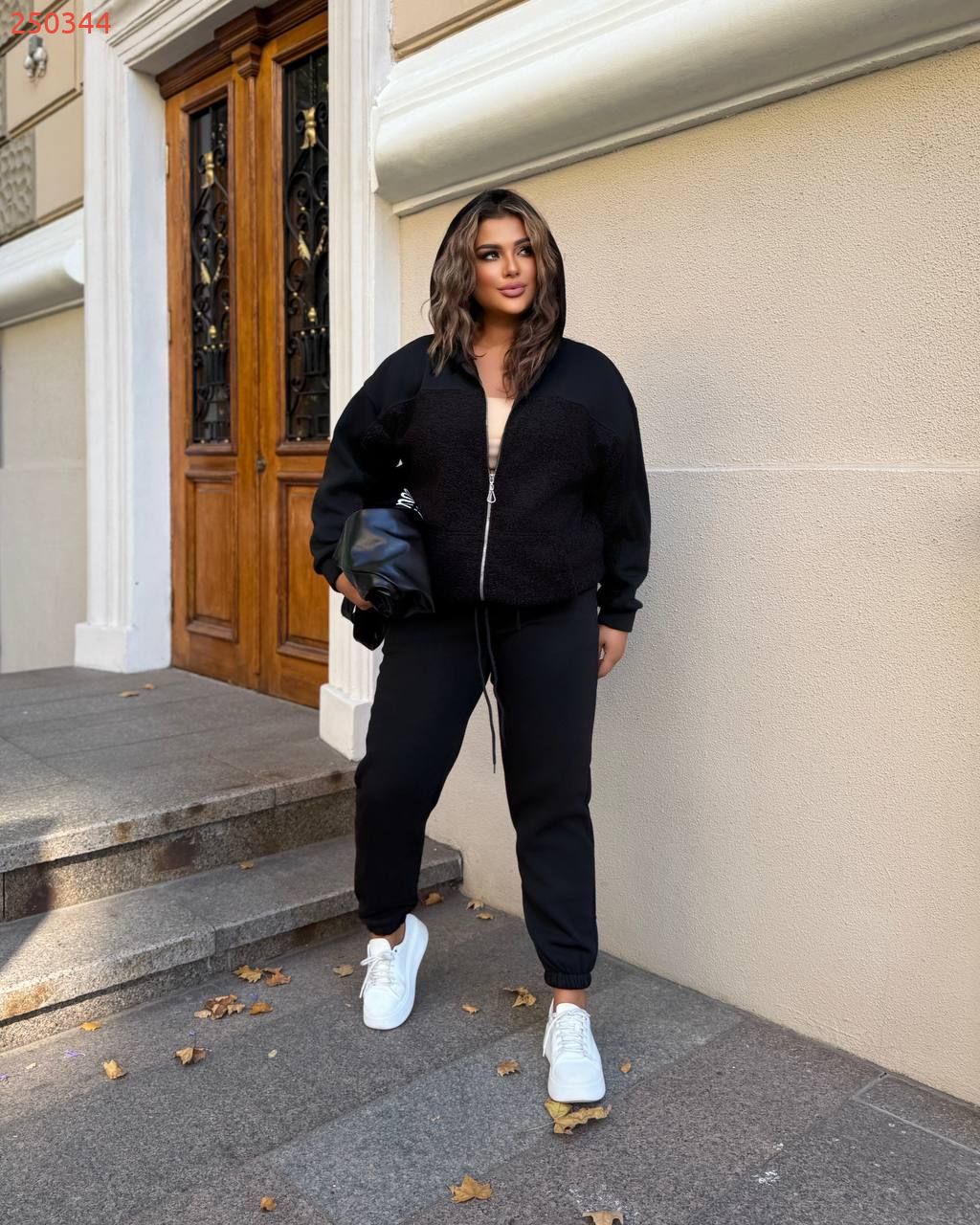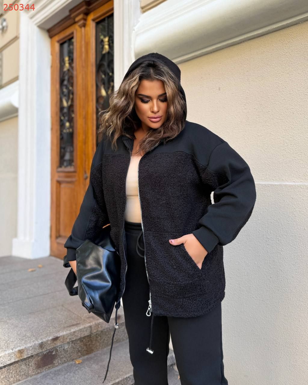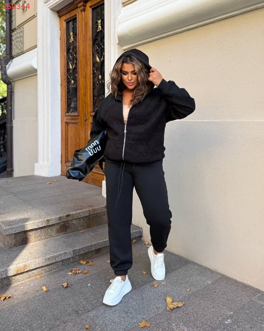 Тканина: Якісний мʼякий дуже теплий еко баранчик на флісі, комбінований чорною Хб стрейч триниткою на флісі. Добра розтяжність.