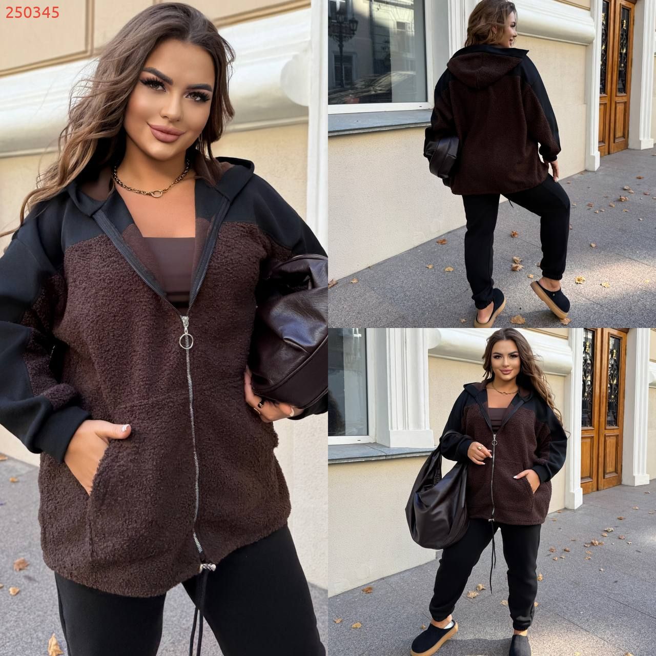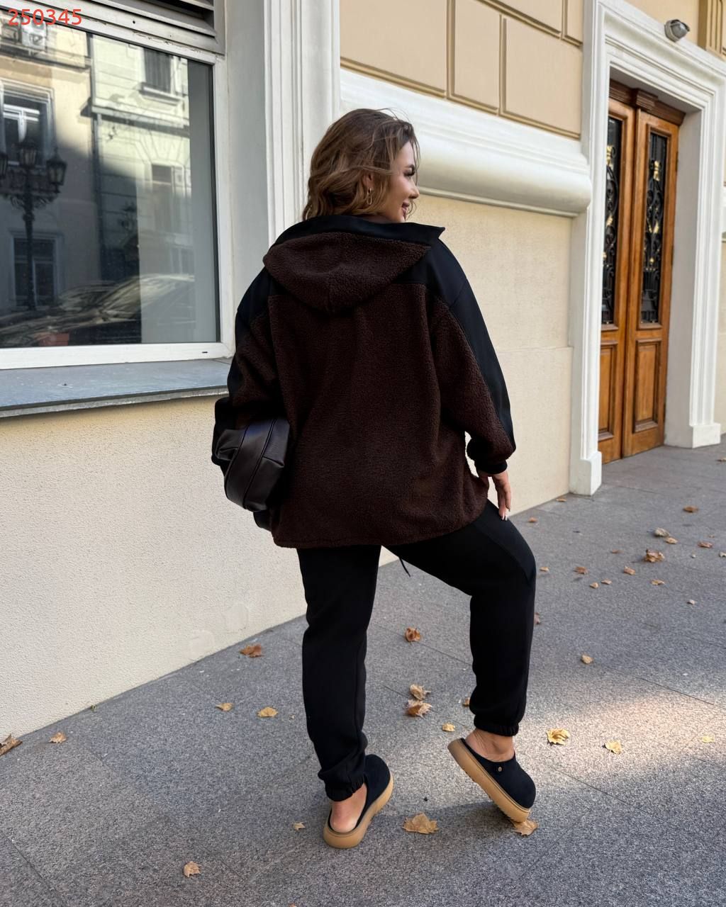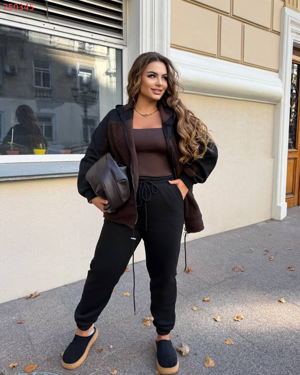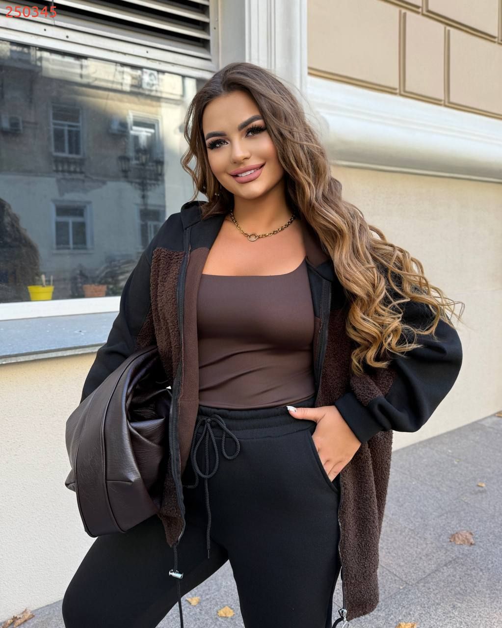 Тканина: Якісний мʼякий дуже теплий еко баранчик на флісі, комбінований чорною Хб стрейч триниткою на флісі. Добра розтяжність.